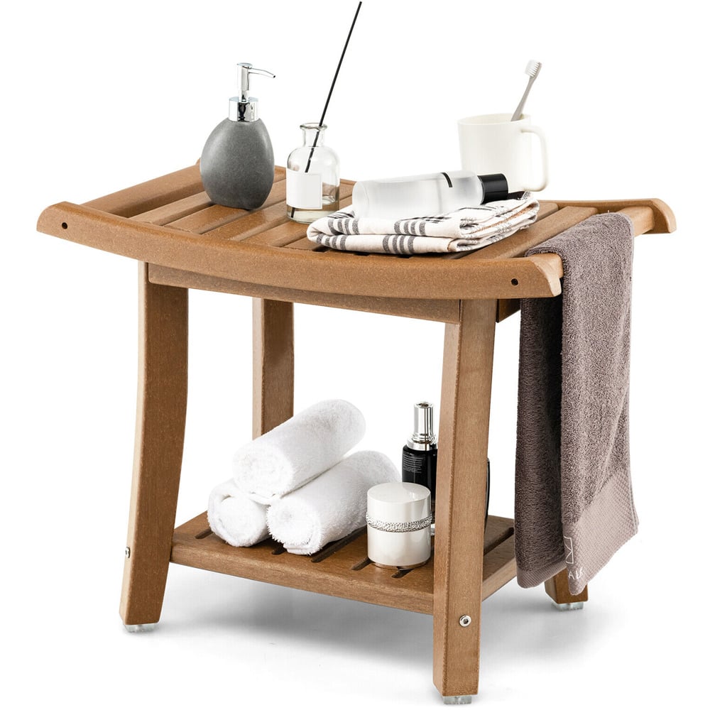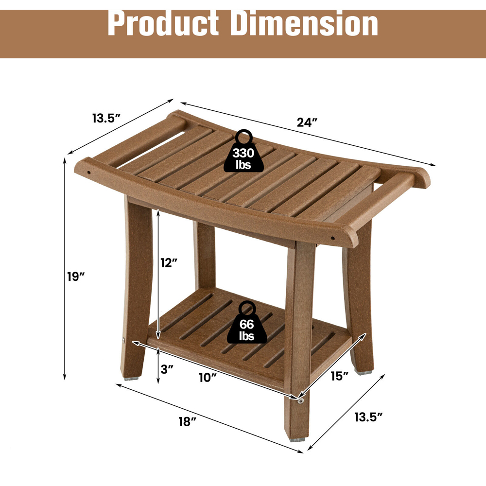 Indulge in the luxury of a rejuvenating shower experience every morning with the Costway Single Shelf Brown HDPE Waterproof Shower Bench. Crafted from high-quality HDPE material with a firm connection, this shower stool ensures good moisture resistance, mould resistance and high deformation resistance for longevity. The curved legs make the shower bench more durable, ensuring high stability and load capacity (150 kg for the top and 20 kg for the shelf). This shower bench is also environmentally friendly and not easy to crack. Plus, the bottom anti-slip foot pads prevent it from slipping away for high safety. Besides, the curved seat with round corners and burr-free edges makes the shower bench safer to use. Providing an agronomic support, this bath stool also ensures efficient drainage. This 2-tier bath spa stool with a shelf offers ample storage space to store and organise bath products or any other items, such as toilet soaps, bath towels, body wash, candles, decorations, magazines and so on. Moreover, the side handles can also be used as towel racks to hang wet towels. In addition to being used as a shower bench in the bathroom, beside the pool, sauna, and hot tub, it can also serve as a shoe bench in the entryway, a vanity stool in the bedroom, and a side table in the living room. The modern, simple style and multifunctional design make the bench a perfect addition to your home. This bath spa bench is easy to put together in a short time since it comes with complete parts, all the necessary hardware and detailed instructions. Furthermore, the waterproof and smooth surface is easy to clean with just a damp cloth.