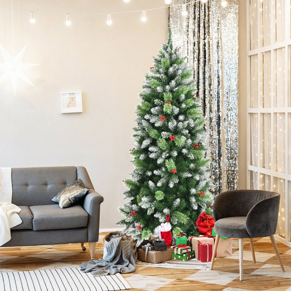 Create an unforgettable Christmas scene for your family and friends with this Costway Snow Effect Artificial Christmas Tree with Red Berries 6ft. This festive tree is perfect for both residential and commercial settings, this slim pencil tree is a must-have. Featuring several red berry clusters, it brings a touch of vitality to any space. The tree is crafted with 475 branch tips, combining faux pine needles and PVC tips, some of which are dusted with artificial snow for a lifelike appearance. With no other ornaments, it offers ample space for you to decorate to your own taste. The tree is easy to assemble with its hinged branches and sturdy metal stand, which also folds for convenient storage and includes protective pads to safeguard your flooring. Measuring just 2.5ft in diameter, it fits comfortably in smaller spaces, making it a versatile addition to your festive décor. Bring a warm, festive atmosphere to your home or business.