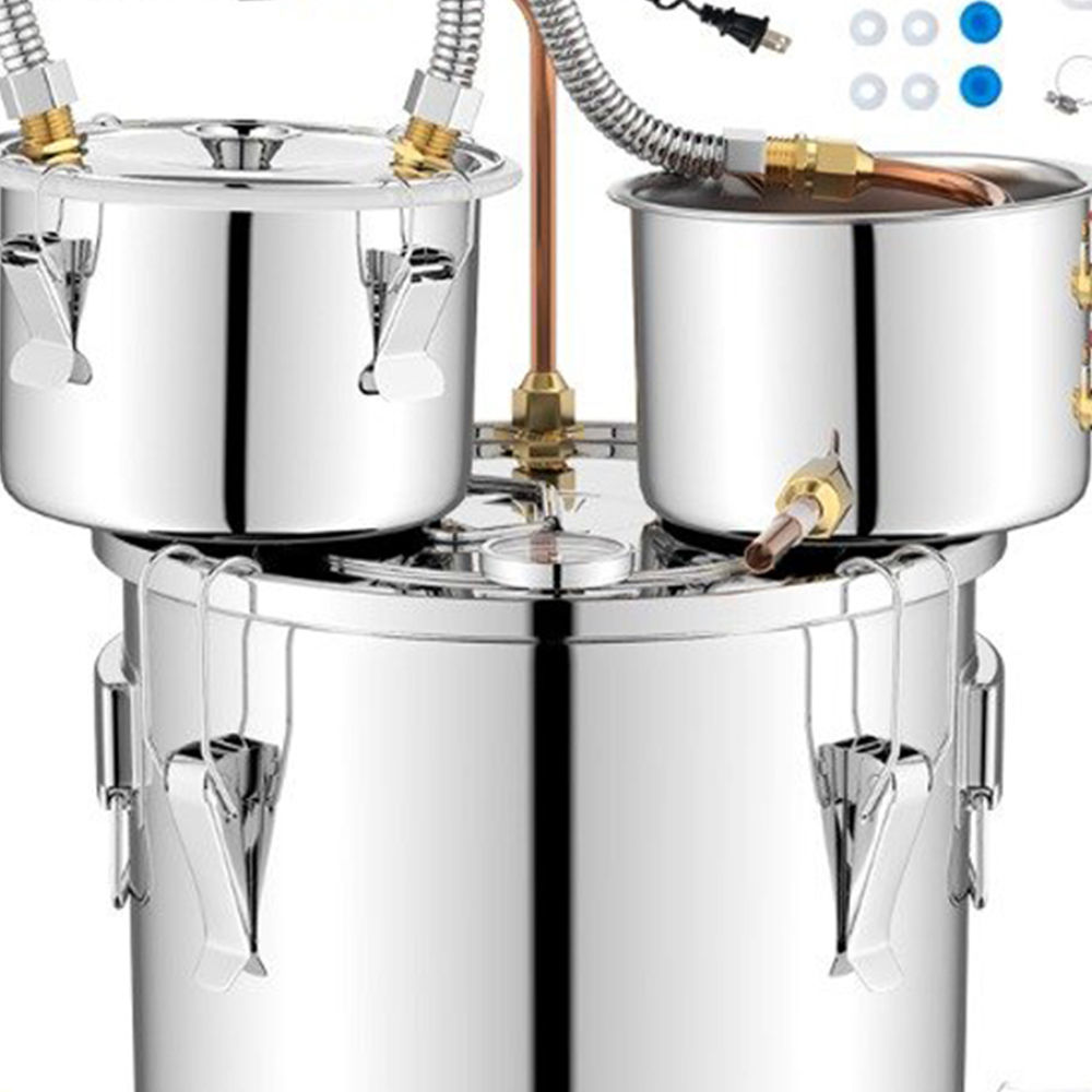 If you are looking for a beginner's brewing tool, then this water alcohol distiller is worth your attention. Made from high-quality stainless steel and copper, this whiskey-making kit features lead-free and high-temperature resistance with a long service life. In addition, unlike other imprecise temperature controls which display only Celsius, our accurate built-in thermometer allows you easy control of the brewing process. In addition, the breeding process is really simple, just put the material in the boiling barrel to make fermented wine and connect the water inlets and outlet to cool the alcohol vapour to form liquid wine. Not to mention the thumper keg which allows for added flavour. With three large brewing pots, a boiler barrel 12.5 x 12 inch (D x H), a condenser 7.9 x 4.3 inch (D x H), thumper keg 8 x 5 inch (D x H), this water alcohol distiller can provide you with a fermentation capacity of five-gallon large capacity and 22L of raw materials. Equipped with a built-in duel display thermometer, our home brewing kit can display Fahrenheit and Celsius to control the temperature more precisely, providing you with an easy-to-use brewing and distilling experience. Made from food-grade stainless steel, this whiskey-making kit features lead-free and high-temperature resistance with a long service life. In addition, you can put the boiling bucket on a variety of different heat sources, such as a gas stove, induction cooker, firewood, or electric ceramic stove. By attaching the water inlet to the faucet, this water alcohol distiller allows the alcohol vapour to cool to form liquid rapidly. In addition, by adopting copper tubes which guarantees an increased cooling area, this home brewing kit can speed up the process of brewing. And the thumper keg enables you to add more flavour to the distilled result. The water-alcohol distiller is perfect for family-together parties and other occasions, such multifunctional equipment can be used to make a variety of drinks to suit your preferences, such as fruit wine fermented crop, wine, whisky, vodka, champagne, brandy, essential oil, distilled water.