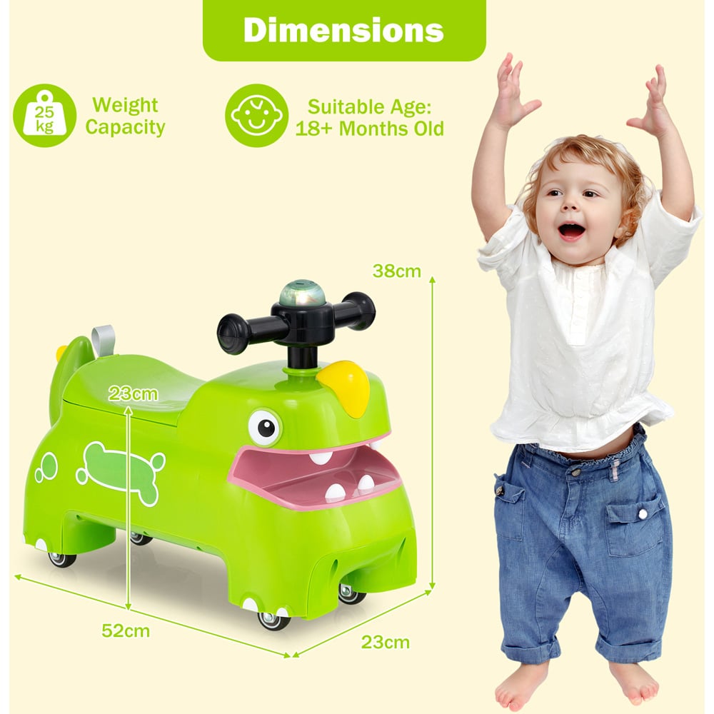 Spark excitement for every adventure with the Costway Toddler Dinosaur Foot to Floor Sliding Ride On Push Car with Storage. Complete with pressable teeth, engaging music and flashing LED lights, this toy makes playtime lively and memorable. Designed for children aged 18 months and above, this foot-to-floor sliding toy offers universal wheels for smooth rides across floors indoors and outdoors. The four-wheel support and widened wheelbase ensure stability and safety with every journey. A spacious seat and an anti-falling safety feature keep toddlers comfortable. The handy under-seat storage lets kids keep their favourite toys or snacks close, making each ride both fun and practical. Not only does it entertain, but it also encourages muscle strength and motor skill development, blending play and growth seamlessly.