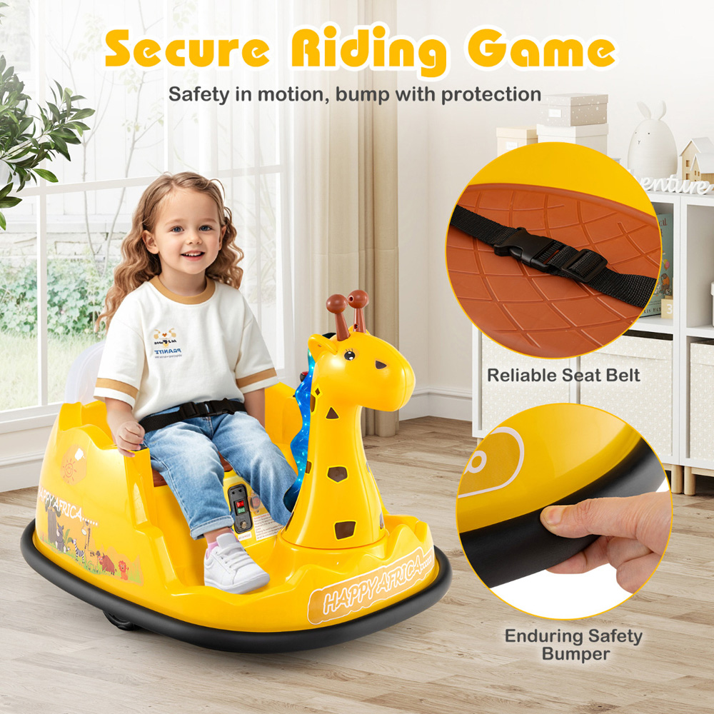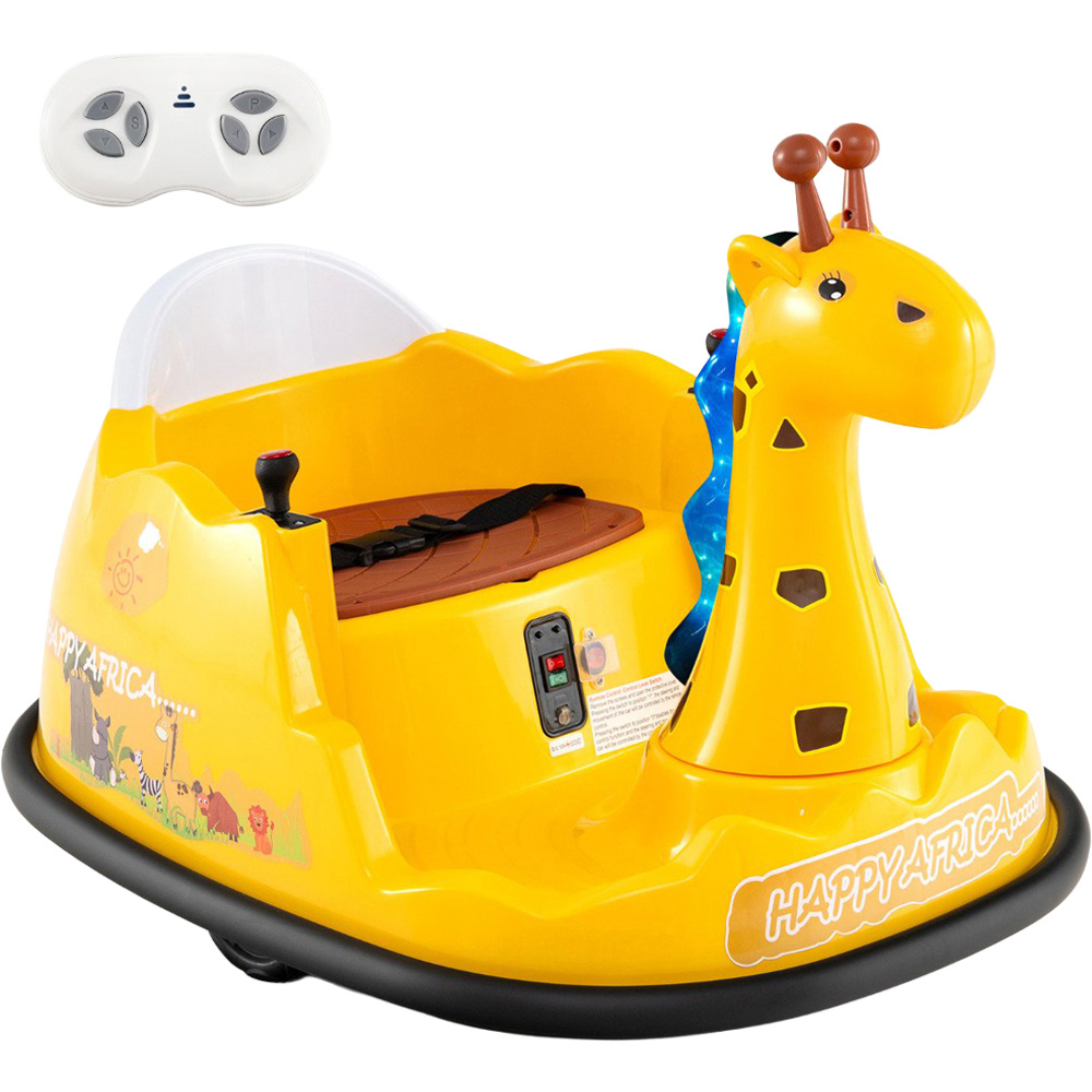 Spin into adventure with the Costway Toddler Yellow Giraffe Ride On Bumper Car with Remote 12V. Powered by a 12V battery and dual motors, it offers smooth 360° spinning action at a gentle speed, letting toddlers race, bump, and glide indoors or outdoors. A soft bumper and safety belt keep playtime secure while parents can choose between a joystick or remote control for flexible supervision. Mesmerising LED lights and playful music add a sensory boost, making every ride a delight for children aged two to five.