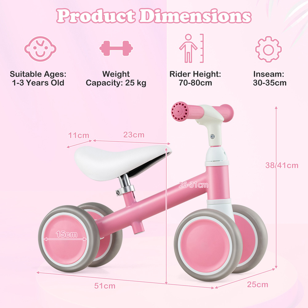 Set little ones off on their first adventures with a pink baby balance bike that adapts as they grow, featuring both height adjustable handle and seat for tailored comfort. Designed to nurture balance and motor skills, the four-wheel stability and 80-degree steering limit offer peace of mind while grip-enhanced handlebars keep tiny hands secure. Smooth EVA foam wheels glide quietly across indoor and outdoor surfaces. Plush seat cushion ensures comfort on every journey. Quick assembly means playtime starts sooner, making it a thoughtful choice for children aged one to three who are ready to build confidence and coordination.