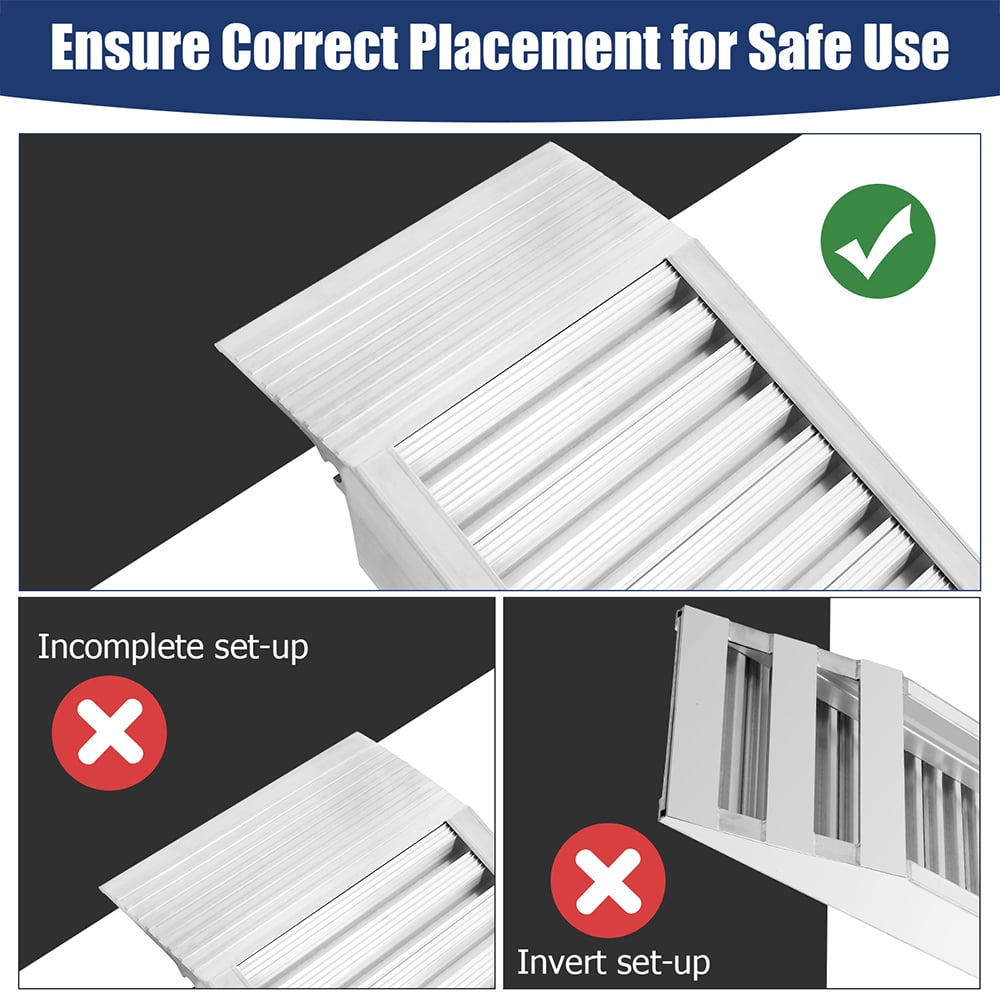 Elevate your loading experience with the Costway Trailer Universal Vehicle Loading Ramp with Extension Plate. It is designed to handle up to 2025kg with ease. Crafted from premium, lightweight aluminium, this ramp offers a smooth, non-slip surface enhanced by an extension plate for added stability, ensuring safe and efficient transport of motorcycles, bikes, ATVs, wheelchairs, and lawnmowers. Its compact design, weighing only 13.5 kg, allows for effortless transportation and storage, making it an ideal choice for users seeking convenience and reliability on the move. Safety is paramount, so please adhere to the provided instructions and wear gloves for optimal handling and placement.