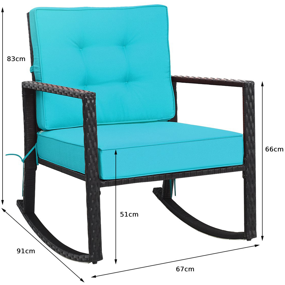 Step into comfort and style with the Costway Turquoise Outdoor Wicker Rocking Chair. Featuring a heavy-duty steel frame in a vibrant turquoise hue, this rocking chair boasts a high-quality woven rattan surface that's both water-resistant and designed to withstand prolonged sun exposure. The robust, rust-resistant metal frame supports up to 180kg, ensuring stability and durability. Its wide backrest and plush, removable cushion offer an oasis of comfort, making it perfect for enjoying a good book or simply relaxing in your patio, garden, or by the poolside. With easy assembly and versatile applications, this chair is not just a seat but a charming enhancement to any outdoor setting.