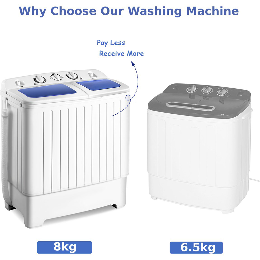 Elevate your home's functionality with the Costway Twin Tub Washing Machine with Time Control 8kg. This portable washing machine features a unique twin tub design, allowing you to move your clothes from the washer to the spinner seamlessly. It has a washing capacity of 5kg and a spinning capacity of 3kg, efficiently cleaning light to medium clothes in one go. The compact washer machine comes with a wash timer, wash/spin selector, and spin timer, making it easy for the whole family to operate. The timer control lets you choose the perfect duration for washing different types of clothes, ensuring a precise clean every time. Equipped with a powerful motor, the washing machine operates quietly while effectively washing and spinning your clothes. The visible lids allow you to watch the cleaning process in action. It features two water inlets and a 97cm drain hose, ensuring effortless water intake and efficient drainage. The back organizer neatly stores the power cord, keeping your space tidy and clutter-free. Designed for versatility, our compact washing machine is the perfect companion for camping trips, apartments, student dorms, and even RV adventures. Its practical design ensures easy storage and use in various environments.