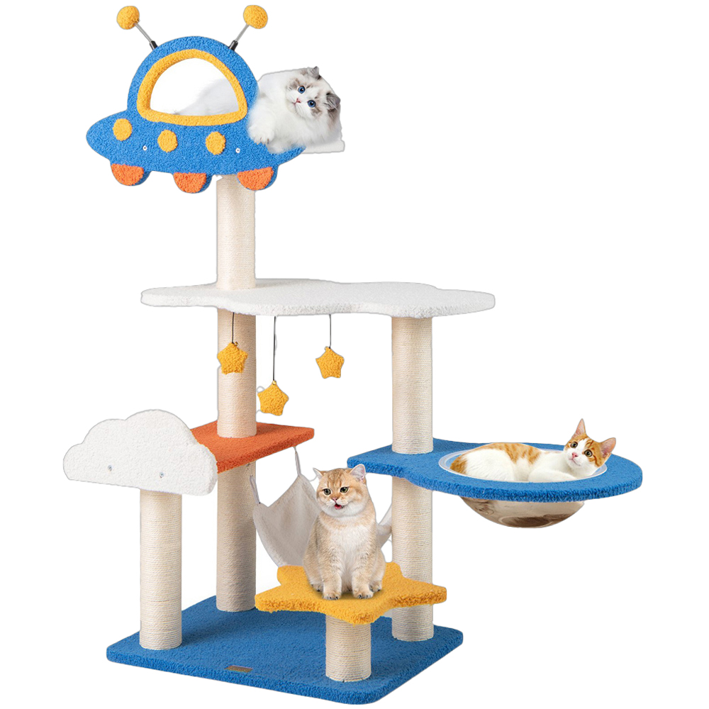 Let your cat explore the cosmos with the 124cm Tall Cat Tree featuring a UFO Top Perch and Space Capsule in a striking blue colour. This multi-level cat tree offers seven layers of adventure and comfort, including a UFO-shaped top perch, a cloud-shaped platform, and a star-shaped platform for your cat to lounge, play, and rest. The transparent space capsule and swinging hammock provide unique and cosy relaxation spots, while the sturdy sisal scratching posts encourage natural scratching behaviour, protecting your furniture. With its engaging design and space-themed elements, this cat tree is not just a playground for your feline but also a delightful addition to your home decor.