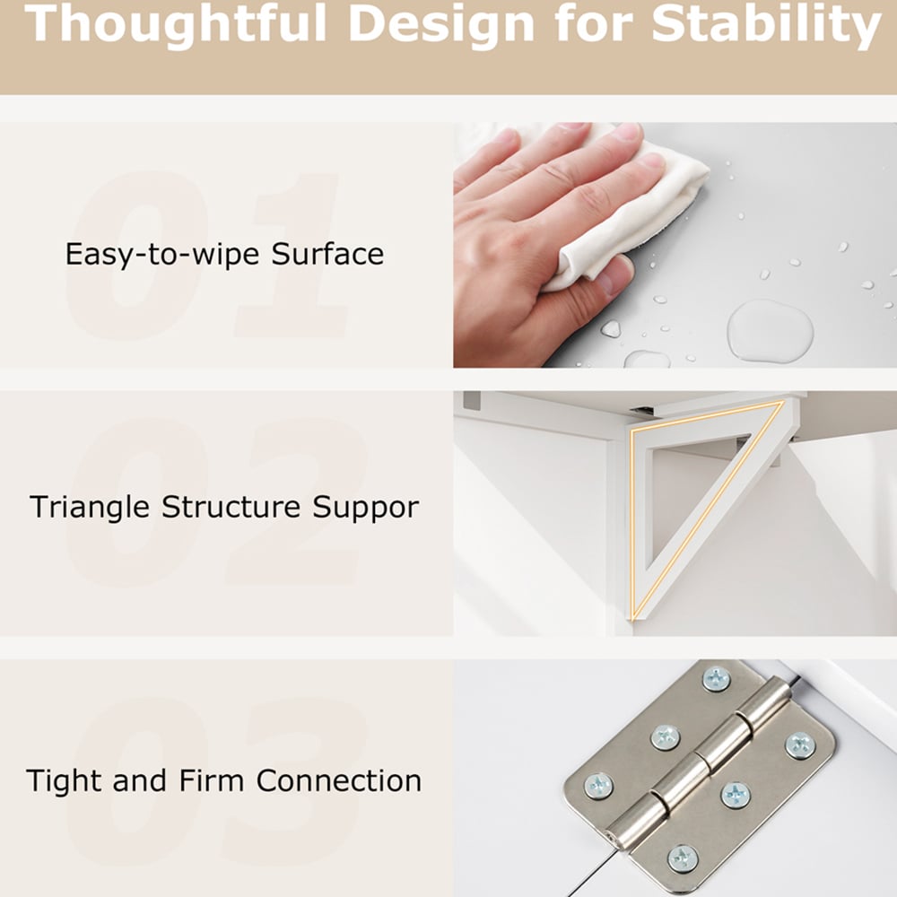 Make a compact and practical addition to your home decor with the Costway Wall Mounted Drop-Leaf Folding Desk White. It features a wall-mounted and foldable design and offers an ideal space-saving solution for those who have limited living space. This desk is large enough for you to place a laptop, a few books, snacks or a potted plant. It has a double-folding design, you can fold half of the countertop and place small items accordingly. You can fold down the desktop completely to save space according to your convenience. It is crafted from premium MDF and solid pine wood with a load capacity of 40 kg. The sturdy wooden bracket in a triangular structure enhances overall stability. It is easy to assemble and comes with detailed instructions and all the mounting hardware. Each screw and pin has its code to let you easily understand the assembly progress.