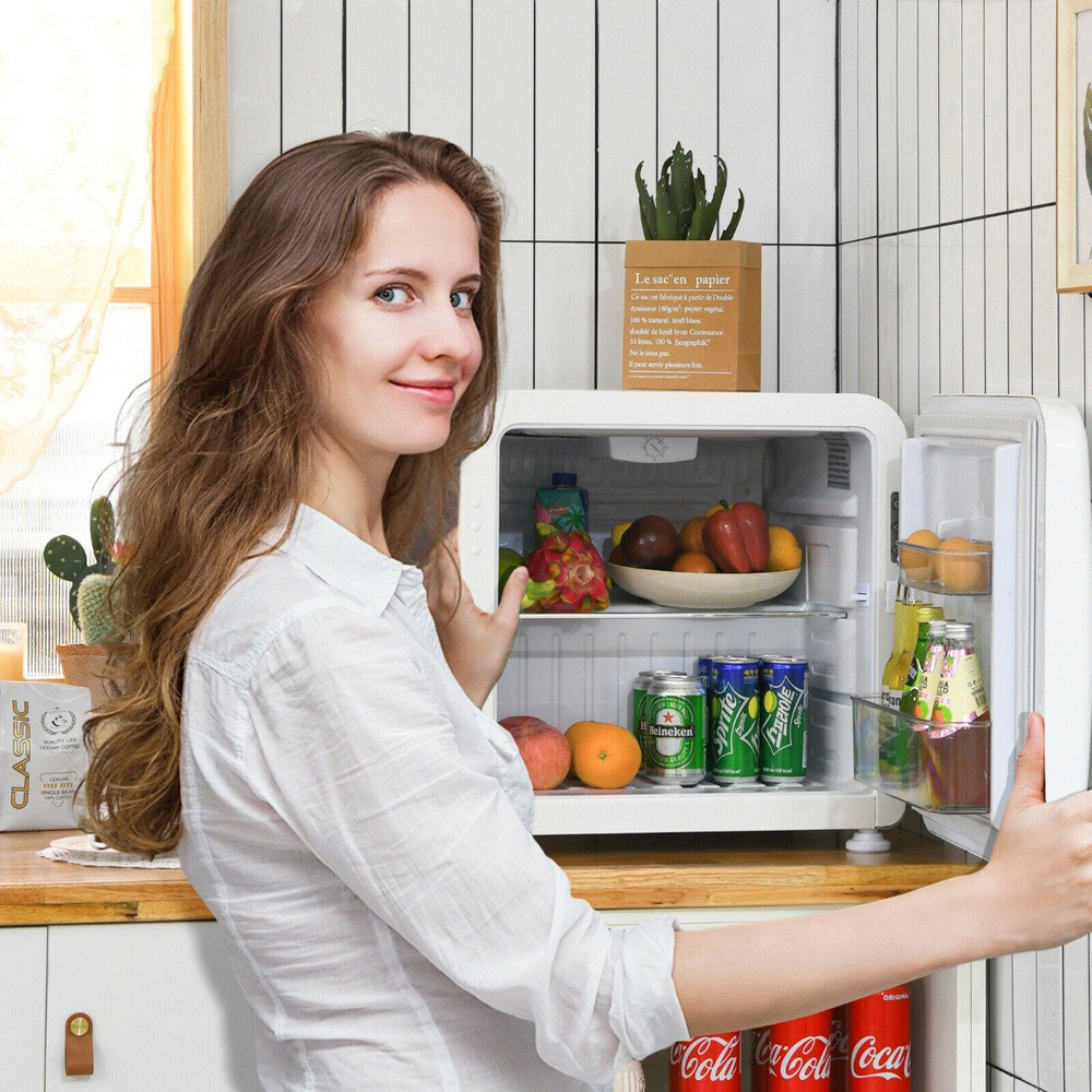 Upgrade your dorm or apartment with the Costway White Compact Refrigerator with Reversible Door. With the mini fridge, you can keep your favourite beverages cool while taking up minimal space and consuming low energy. The temperature of this refrigerator can be easily adjusted between 0-10°C by rotating the built-in temperature control knob. It also features an automatic defrost function, with the defrost water channelled into a drip tray located above the compressor. This mini fridge includes one glass shelf and two bottle racks, providing a spacious 45L interior space for storing fruits, vegetables, beverages, and more. The glass shelf can be removed or adjusted to accommodate different storage needs and for easy cleaning. The cooler comes with a reversible door that can be opened to the left or right, offering flexibility in placement. The adjustable feet on the bottom ensure stability, even on uneven surfaces. The built-in LED light illuminates the interior of the fridge at night. This compact fridge operates at a low noise level below 42dB, creating a quiet environment for sleeping or working. Equipped with a high-quality compressor, it efficiently chills food and beverages while consuming minimal energy. With its compact size, this table-top cooler is ideal for countertops, desktops, or floors in small apartments, bedrooms, living rooms, offices, or dormitories. The sleek, retro style adds a touch of elegance to any living or working space.