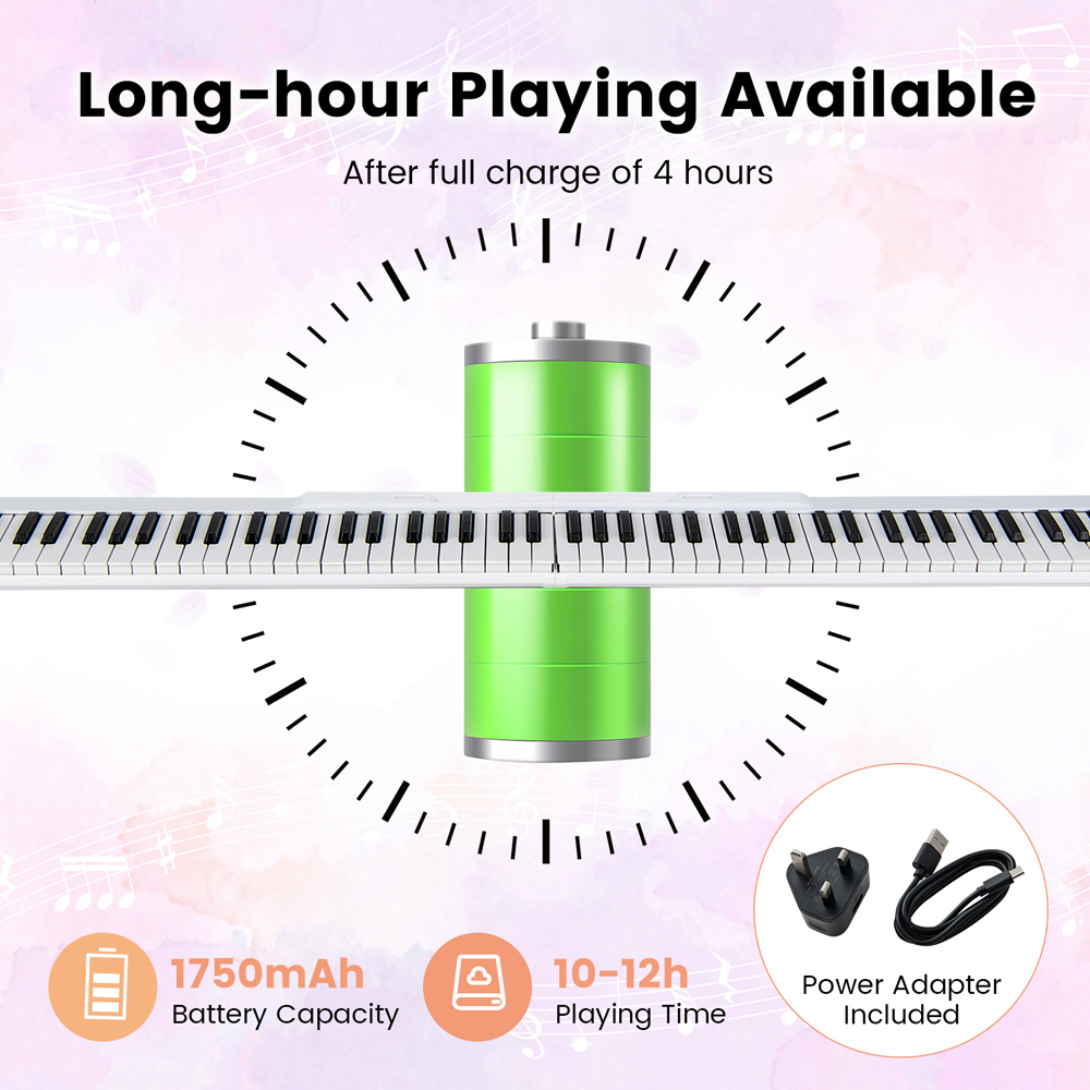 Unleash your musical creativity with the sleek and portable 88-Key Digital Piano, perfect for beginners, kids, and adults alike. This compact powerhouse features full-size touch-sensitive keys that respond intuitively to your touch, mirroring the dynamics of a traditional piano. With Bluetooth and MIDI connectivity, you can effortlessly link up to various devices and apps, enhancing your learning and playing experience. Whether at home or on the go, the foldable design and included carry bag make it easy to transport your musical journey wherever you desire. Plus, with up to 12 hours of playtime on a single charge, your sessions can be as long and as inspired as you wish.