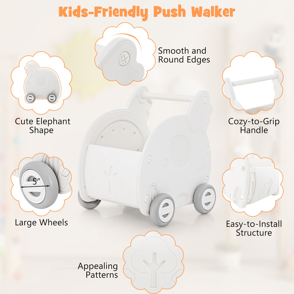 Make an adorable addition to your little one’s toy collection with the Costway White Baby Walker Push Toy. This innovative push toy serves as both a push walker for babies learning to walk and a shopping cart for imaginative play and is suitable for children aged three and older. Constructed from safe and BPA-free HDPE material and certified by BS and EN71 for top-notch durability and safety. The ergonomic design, and spaced rear wheels, promote proper walking posture and help prevent issues like O-legs. The baby walker also features ample storage space, allowing children to carry their favourite toys and snacks, promoting organizational skills. This push toy makes an excellent gift, combining educational value with playful charm, sure to delight your child and support their growth and development. The 34cm reasonable distance between the two rear wheels provides enough space for kids to push and walk. With its kid-friendly design, cute elephant shape, appealing patterns, and easy-to-install structure, this push walker will be the perfect gift for your little one, freeing the parent's handle and saving much effort.