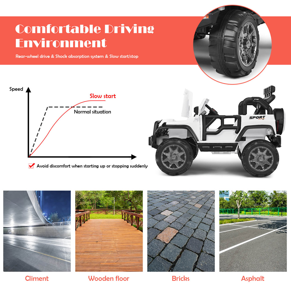 Come with a 2.4G remote control that makes it possible for parents to control the speed and direction of the car, so as to free parents from concern about their children. They can move forward or backward at a high a low speed as well, using a corresponding switch. It also strikes the perfect balance between safety and comfortableness, which can be reflected in the two wide seats with safety belts, safety handrails, soft start and stop, etc. Meanwhile, the spring suspension is designed for a smooth and stable performance with less shock. Furthermore, dynamic music, bright LED lights and loud horns can not only provide a realistic driving experience but also bring endless fun. All in all, this electric ride-on car crafted with safety material and certified by ASTM certification will be a perfect toy for your children. There are two wide seats to accommodate two children at a time so that children can share driving fun together. Meanwhile, it is equipped with a safety belt and handrail, intended to provide protection for children. Higher bearing capacity leaves you no worry about driving safety as well.