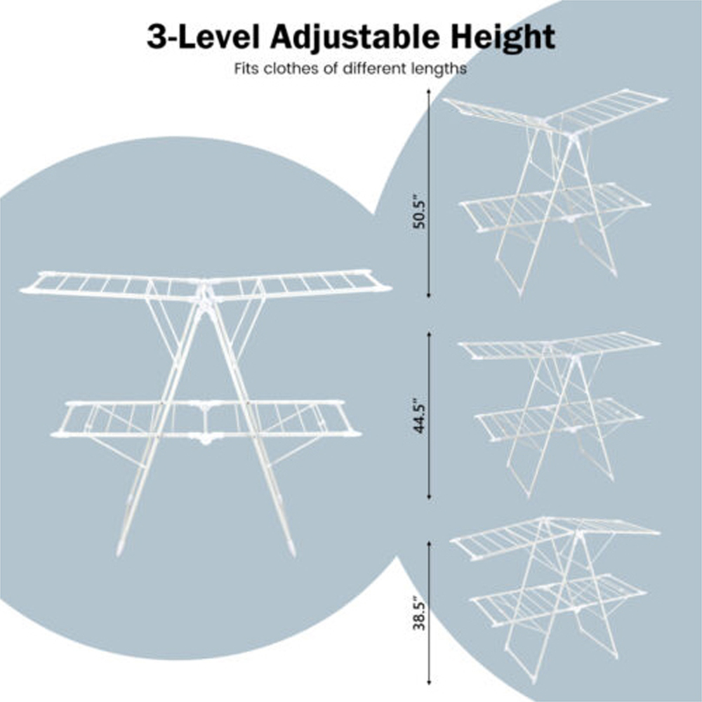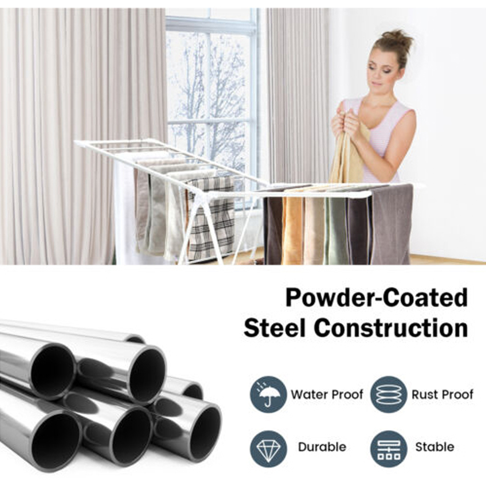 Discover the secret of wrinkle-free, fresh-smelling laundry with the Costway White Foldable Clothes Drying Rack with 28 Hanging Rails. Designed with 4 wings and 28 hanging rails, this 2-tier laundry drying rack can meet the clothes drying needs of the whole family. It also offers a large drying space for your clothes, towels, sheets, socks, shoes, underwear, kids' clothes, and more. In addition, the top 2 wings can be easily adjusted to 3 heights to dry skirts, pants, sheets and more. The fixing buckle and connector help to keep the wings in place. Crafted from rustproof and waterproof powder-coated steel tubes, this ready-to-use rack ensures great stability and long-lasting use. It is ideal for indoor and outdoor use. Plus, the laundry drying rack is easy to open and fold up for easy storage. Due to the quick folding design, this rack can save plenty of space when not in use. You can store it beside the washing machines or any corner when not in use to save space. Besides, the lightweight design allows you to transport it to the laundry room or the patio with ease. Plus, the non-slip and anti-wear foot pads enhance stability and durability. You don't need to spend a lot of time on troublesome assembly since no tool is required to set this up.