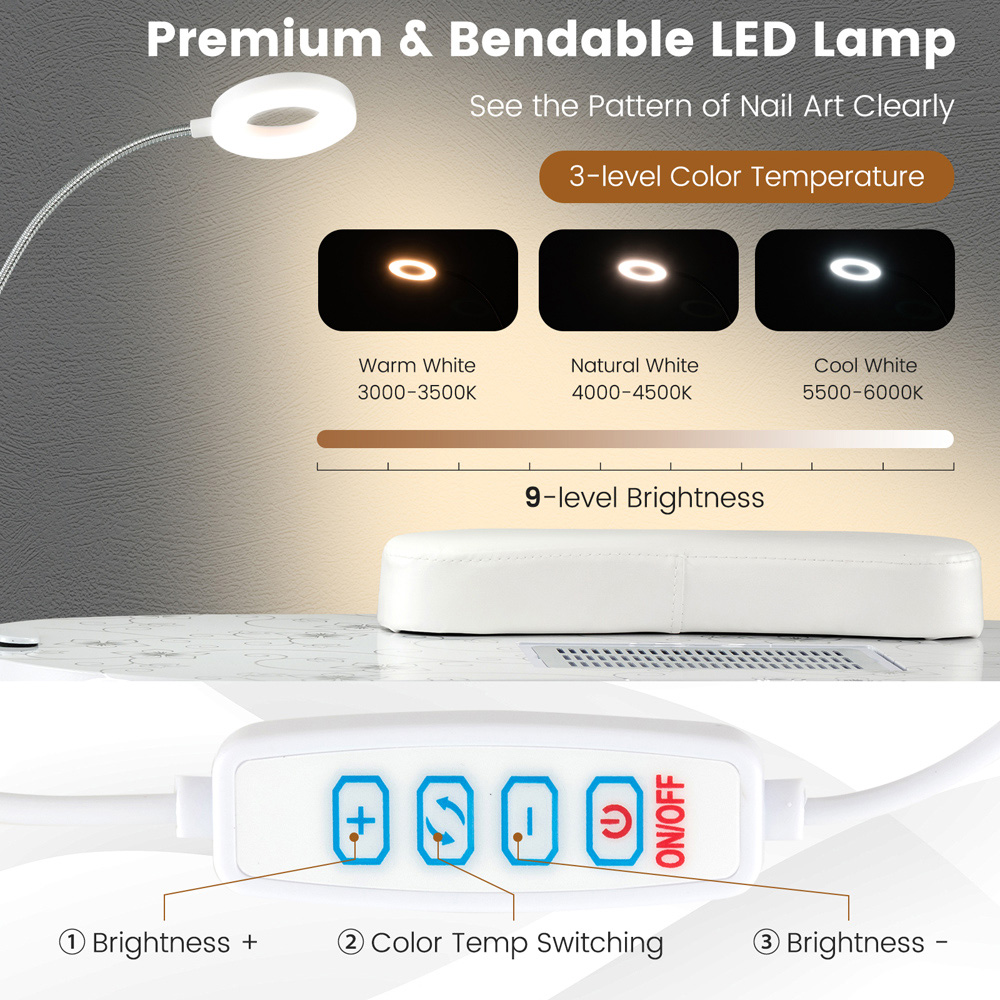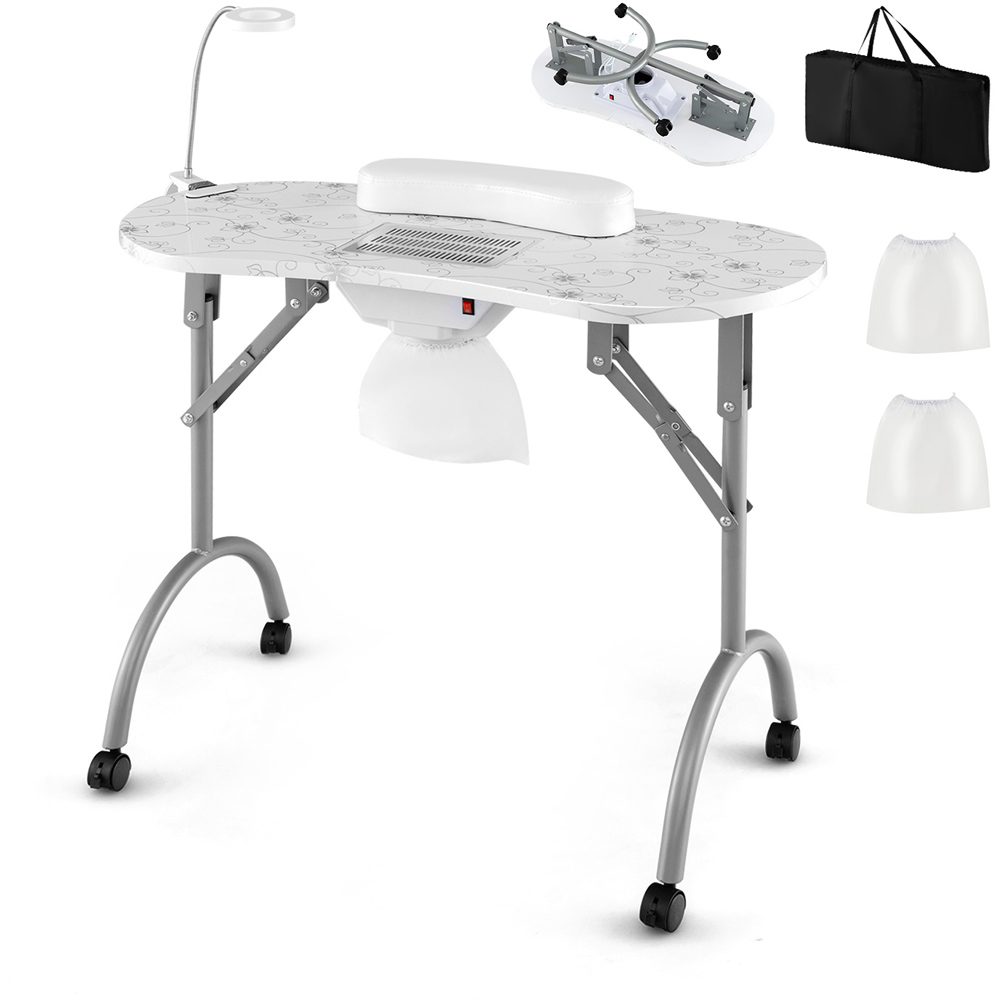 This Costway White Folding Manicure Nail Table will be the perfect choice for manicurists who provide door-to-door service! Different from others, these are equipped with an electric dust collector that absorbs the dust to keep the desktop clean. Besides, it comes with a bendable LED table lamp that features 3-level colour temperature and 9-level brightness that is convenient for you to check the nail art patterns. Also, caring about your customers, it is equipped with a soft wrist pad which is filled with high-density sponge for this nail table. Your customers can put their wrists comfortably on it. After finishing the job, just fold the nail table up and put it into the carrying bag for your next door-to-door manicure service. Through the one-click operation, the electric dust collector is easy to use. It effectively absorbs dust to keep the desktop clean while trimming nails. Besides, the three included dust bags are convenient for daily replacement. The LED table lamp features three-level colour temperature and 9-level brightness that allows you to adjust it according to the environment. Moreover, you can adjust its angle as well to see the pattern of nail art clearly. This manicure nail table can be folded into a compact size. After that, the carrying bag exactly fits the folding state. Therefore, you can store it in the corner or carry it wherever you want. This folding nail table is equipped with four lockable universal wheels that are quiet, smooth and flexible, allowing you to move it on the wooden floor, ceramic tile or carpet with ease. Padded with high-density sponge, this removable wrist pad brings comfortable and soft support. In addition, it is covered with waterproof and oil-proof faux leather that provides great convenience for nail enhancement.
