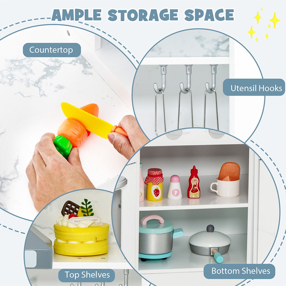 Let your little ones get creative with the Costway White Kids Corner Kitchen Playset. This kitchen playset boasts realistic light and sound effects on the microwave, range hood, separate wash basin and stoves. The wash basin is also equipped with a unique sound and light sensor setting for extra fun. And this has more interactive areas, such as an ice maker, a chalkboard and rotary knobs. Kids are allowed to simulate washing, baking, lighting or cooking. Moreover, it is equipped with a side hook, an upper shelf, two bottom shelves and three utensil hooks for kids to store kitchen accessories. Thanks to its corner design, you can place it in any corner of your children's room, making it ideal for small spaces. The rotary faucet and detachable sink enable your little one to pretend to wash vegetables. Besides, the faucet can also produce interesting sounds and lights through induction. It requires 2 AAA batteries, not included. There are realistic sound and light effects on the microwave oven, range hood and double stoves with steam. And the turntable knobs make sounds when kids rotate them. Thus, your little one can feel like cooking in a real kitchen. Tips: It required 6 AAA batteries, not included. They are allowed to place the ice cubes and press to get ice cubes to enjoy the realistic ice maker. The bottom roaster and simulated dishwasher allow kids to pretend to bake and clean dishes. They can also draw or write on the chalkboard to spark their imagination and creativity. The hook on the left side is a nice place to hang a kid’s chef hat or apron. The upper shelf and two open shelves provide enough storage space for different play foods to help kids develop a good habit of organizing. It’s suitable for kids over three years old. Children can promote their life skills, hands-on ability and hand-eye coordination, and it’s approved by BS EN71.