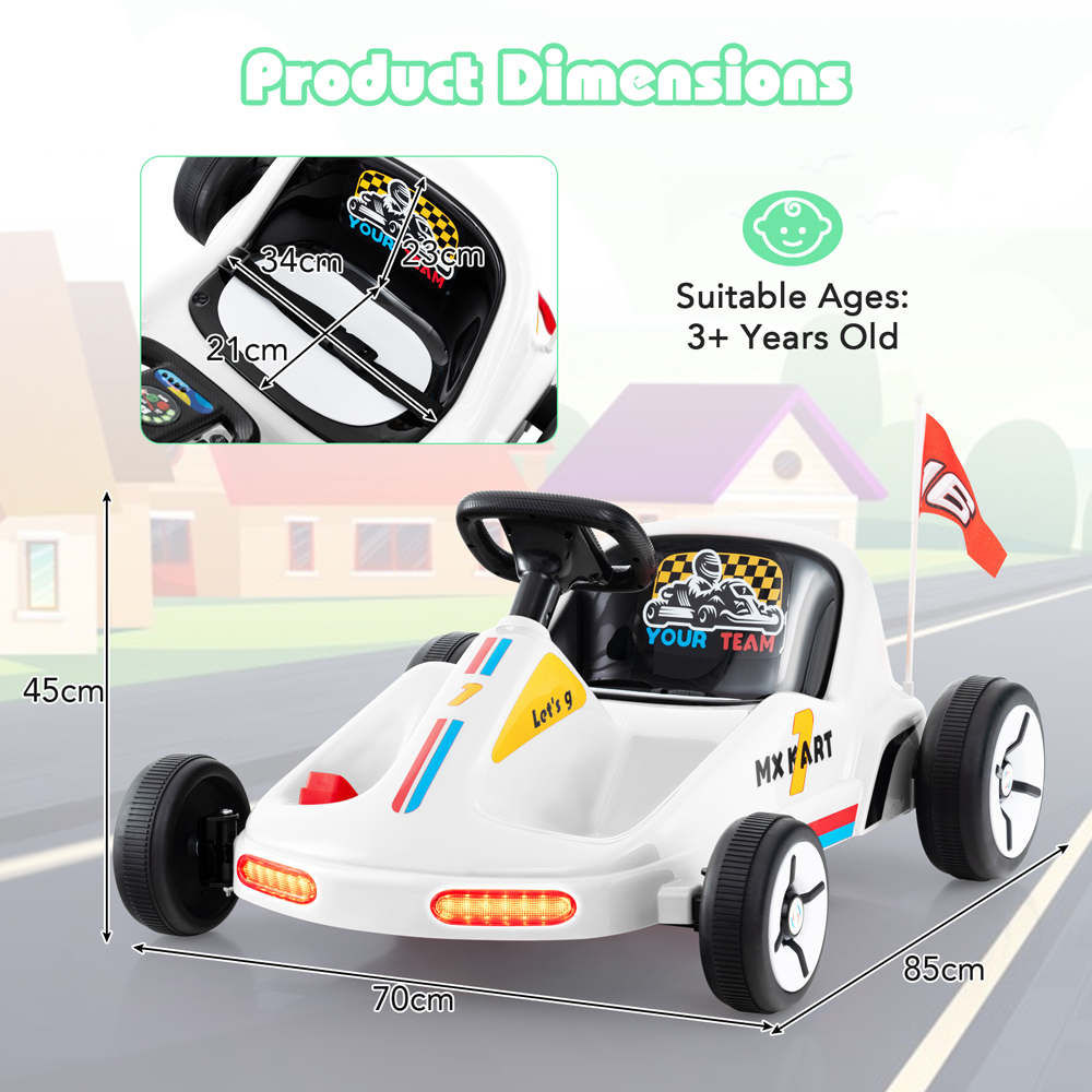 Experience the thrill of driving with the Costway 12V Kids Electric Go Kart, equipped with a remote for enhanced safety and control. This sleek white go-kart not only promises loads of fun with its three-speed settings and built-in lights, but it also ensures a secure ride. Complying with CE and EN71 standards, it's designed to provide both entertainment and peace of mind, making it a superb choice for your young adventurer.