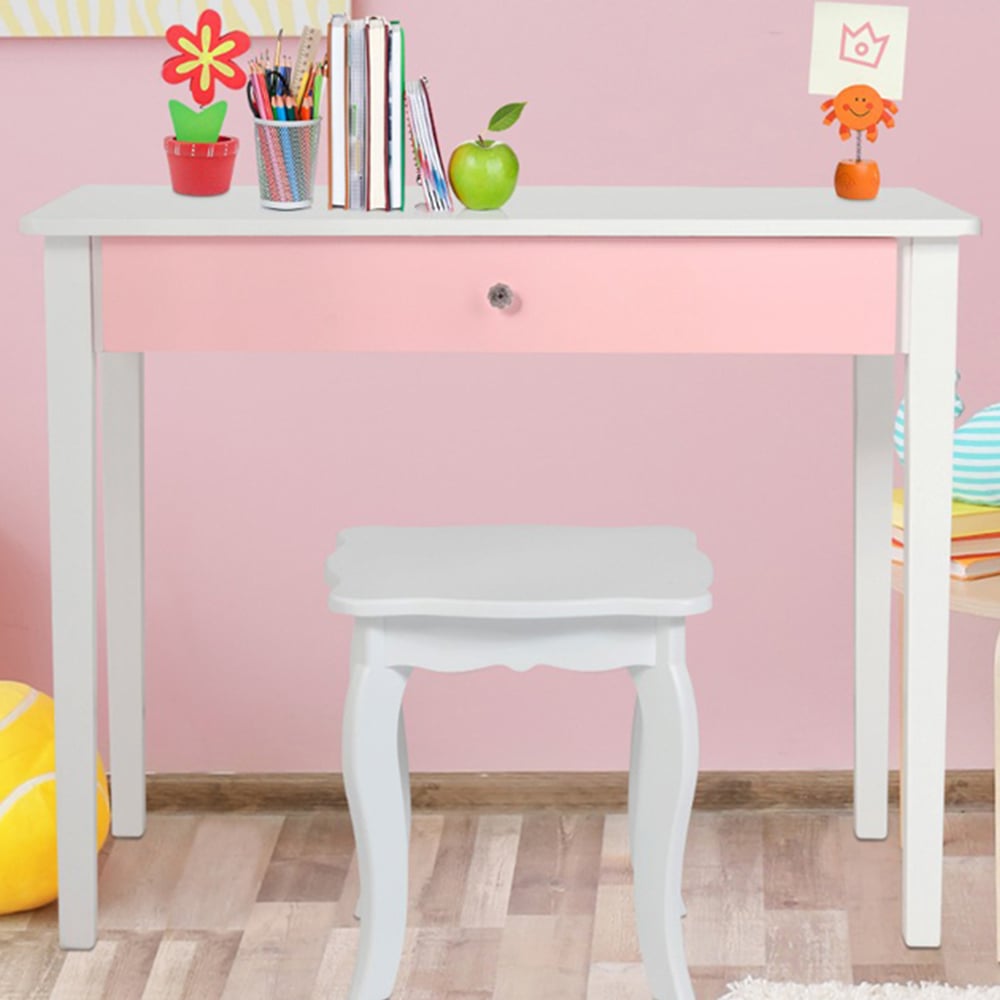 Brighten up your little girl's room with the Costway White Kids Princess Makeup Vanity Dressing Table and Stool Set. This enchanting set not only serves as a magical spot for makeup and hairstyling but also converts into a writing desk, thanks to its removable mirror. Crafted from robust MDF and solid pine wood legs, it promises durability and stability. The tri-folding acrylic mirror offers a high-definition reflection, perfect for perfecting those adorable looks. A large drawer provides ample space for storing all beauty essentials securely. Safety is paramount with rounded corners and an anti-toppling device, ensuring a worry-free experience for parents and fun for the kids.