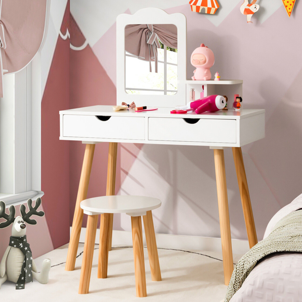 Make a functional and pretty addition to your child's room with the Costway White Kids Vanity Table and Stool Set with Mirror. The durable MDF and solid pine wood ensures long service life, enabling the vanity table set to accompany children for years to come. This vanity table and stool set comes with a square mirror and detachable top, the top part of the table can be easily detached , so that your little princess can use the table as a dressing table or a study desk according to her different requirements. In addition, the small stool not only provides your child a comfortable seat, but also can be tucked under the table to save space. It offers ample storage space with a spacious tabletop and a storage shelf that can accommodate plenty of children's favourite beauty accessories and stationery. Other than that, there are two large drawers to hide away small items and sundries. Different from other vanity table and stool sets which are crafted from inferior MDF, this is supported by solid pine wood legs, which is more durable and boasts stronger loading capacity. Meanwhile, the rounded corner and burr-free surface greatly improves safety. Detailed instruction and complete accessories are included in the package for easy and quick installation. All you need to do is to follow the instruction step by step. The waterproof and smooth surface is convenient to clean with a soft cloth.