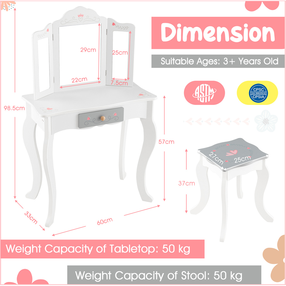 Ignite your little one's imagination with the Costway White Kids Vanity Table and Stool, featuring a detachable tri-fold mirror and an array of cute accessories. Perfect for both play and practical use, this versatile set transforms from a makeup station to a writing desk with the removal of the mirror top. It's crafted to foster independence, allowing children to organise their essentials in the spacious drawer and enjoy pretend play with accessories like a hair dryer, perfume, and an eyeshadow palette. Safe, sturdy, and stylish, this vanity table is an ideal gift that blends beautifully into any children's bedroom decor, making every day an opportunity for your child to shine like a princess.