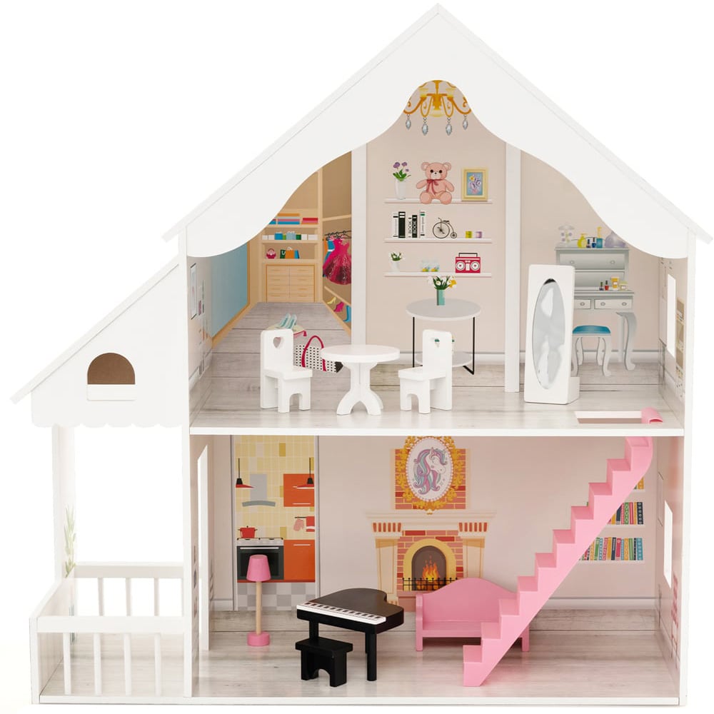 Let your little ones get creative with Costway White Kids Wooden Dollhouse. This wooden dollhouse playset is a perfect gift for your princess. It has three stories, six realistic rooms and eight pieces of mini furniture to create an immersive experience and encourage kids to DIY. The side skylights, ventilated windows and vivid wallpapers make it attractive. The large house is 86cm high, which is ideal for kids aged three + years old to play. Additionally, the upper floor is 42 cm high and the lower floor is 33 cm high, which enables kids to store their dolls. This two-story semi-opened dollhouse features a kitchen, a living room, a cloakroom, a vanity room, a studio and a porch, offering a realistic experience. The height of the first floor is 42 cm and the second floor height is 33 cm, which is ideal for placing 36 cm or 28 cm dolls. Specially design each room with a movable furniture set. Your little princess can freely arrange the furniture to build their dreamy house, which helps to develop imagination and creativity. The premium MDF panels and child-safe acrylic material are durable and odourless, which will accompany your little one for years and do no harm to your kid’s health. The wooden dollhouse is equipped with a unique roof, two side skylights, ventilated windows and exquisite wallpapers. Thus, this dollhouse playset looks more realistic and will appeal to kids over three years old. Measuring H86 x W30 cm x L81cm, it provides a large area for kids to play.