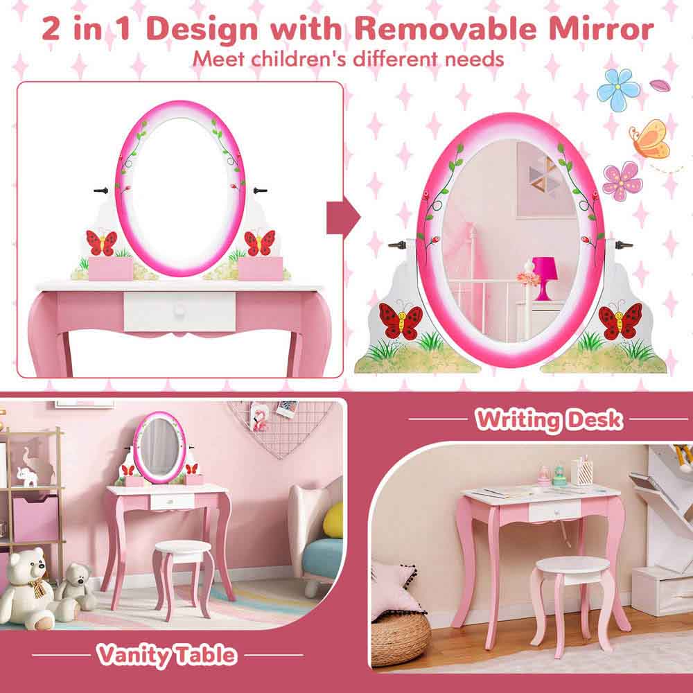 Create a functional and charming addition to your child's room with the Costway White and Pink Kids Vanity Table and Stool Set with Mirror and Whiteboard. This set includes a mirror for the vanity table made of safe and durable acrylic with a 360-degree rotation. The front side is a makeup mirror, while the back side is a whiteboard for drawing and writing. Additionally, the dressing table set comes with four colourful markers. The tabletop features two small storage grids, ideal for keeping your child's accessories organized. Furthermore, there is a drawer underneath the table for extra storage space. The table is equipped with an anti-tilt device at the back, and the table and stool legs are both fitted with non-slip foot pads to enhance stability. Also, the white drawing board on the back of the mirror allows kids to unleash their creativity and imagination. Moreover, with BSEN71 certification, the vanity set ensures reliable quality and security.
