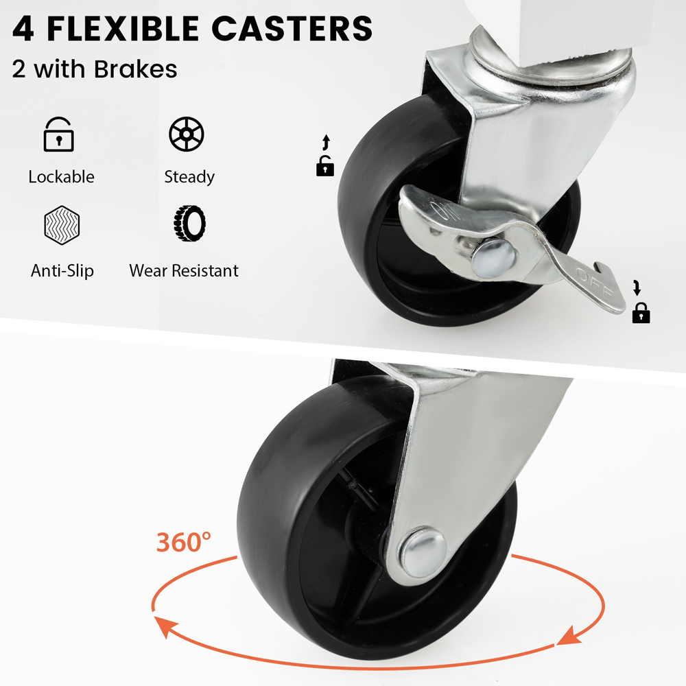 Elevate your culinary space with the Costway White Rolling Kitchen Island Cart with Rubber Wood Top. Designed to blend convenience with modern style, this versatile cart features an array of storage options including four open shelves, two pull-out drawers, a spacious top, and an enclosed cabinet with an adjustable shelf, all crafted to accommodate items of varying heights. The natural rubber wood countertop is not only aesthetically pleasing but also ideal for food preparation and display, ensuring durability and ease of maintenance. With four rotatable and lockable wheels, this kitchen island can be easily moved or stationed securely, making it perfect for both cooking and serving. Its user-friendly design, complete with smooth metal drawer slides and easy-to-grip knobs, ensures a hassle-free assembly and a seamless addition to any kitchen or dining area.