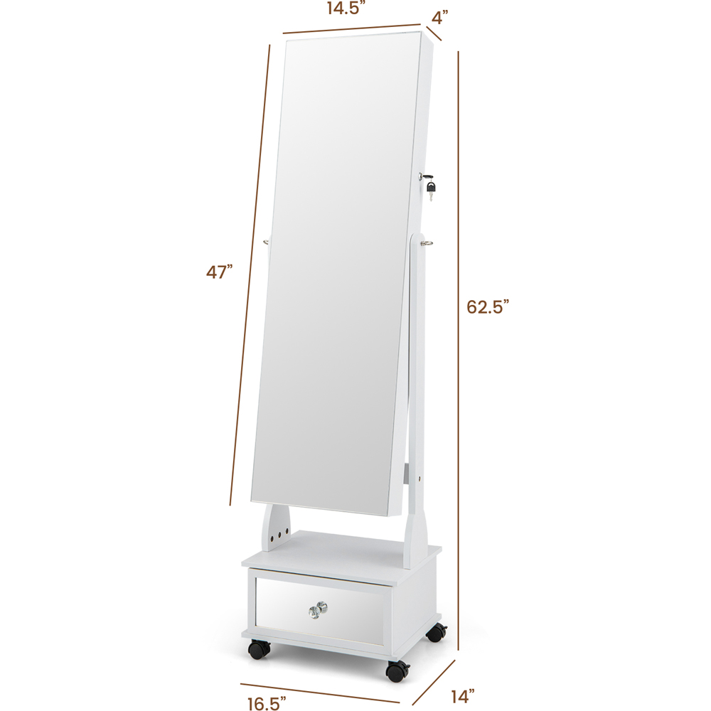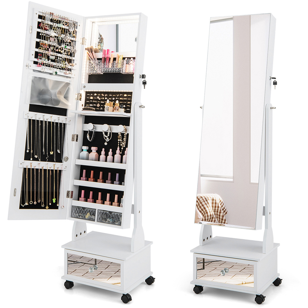 Discover a new way to showcase your jewellery with the Costway White Standing Jewellery Armoire. Apart from organising jewellery, this jewellery cabinet also gives you a head-to-toe wide and clear view to check your everyday outfit with a full-screen HD mirror and a vanity table. Moreover, the jewellery cabinet has three adjustable tilt angles, allowing you to find the most suitable view angle. The foldable acrylic shelf makes your makeup routine more convenient. Plus, the bottom large drawer features a front acrylic mirror panel design for added fashion. There is a small mirror inside the jewellery organiser cabinet as well. Along with the three-colour LED lights (yellow, blue, blue and white mix), you can select and try on jewellery conveniently. Inside the jewellery armoire, there are 84 earring slots, 36 earring stud holes, one zippered storage bag, 24 necklace hooks, one acrylic cosmetics and lipstick box, 65 ring slots, three bracelet rods, three storage shelves and two acrylic drawers. Besides, the bottom shelf and drawer offer additional storage space for large items, like bags, books, etc. These lights are powered by three AA batteries which are not included. Equipped with soft velvet lining and a lockable door with keys, the floor-standing jewellery armoire is sure to keep every piece of your jewellery intact and undamaged. Moreover, it contains four lockable universal wheels that allow you to move the cabinet anywhere.