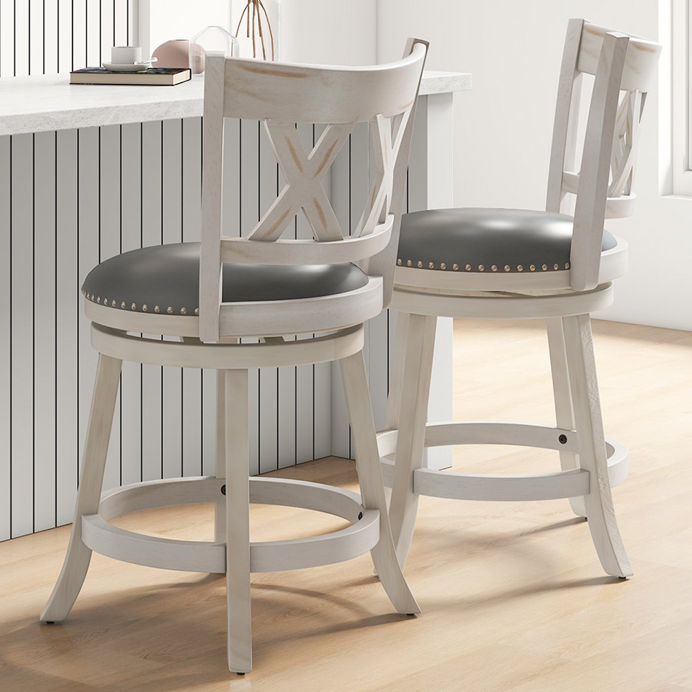 Experience the charm and functionality of the Costway White Antiqued Swivel Bar Stool Set of 2. It not only enhances your space with its rustic aesthetics but also offers unparalleled comfort. Featuring a 360-degree swivelling seat, this stool set allows for easy mobility and interaction in any setting, whether it's your home kitchen or a cafe. The wider seat, upholstered with smooth PVC leather and padded with a sponge, ensures a comfortable sitting experience for varied body types. Its solid rubber wood frame provides robust support, making it a durable choice for frequent use. The curved backrest and footrest are thoughtfully designed to support your back and feet, ensuring you can relax and enjoy your time comfortably.
