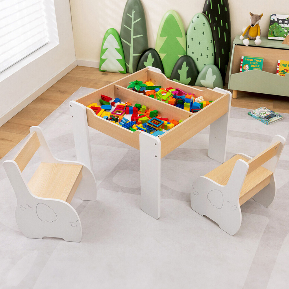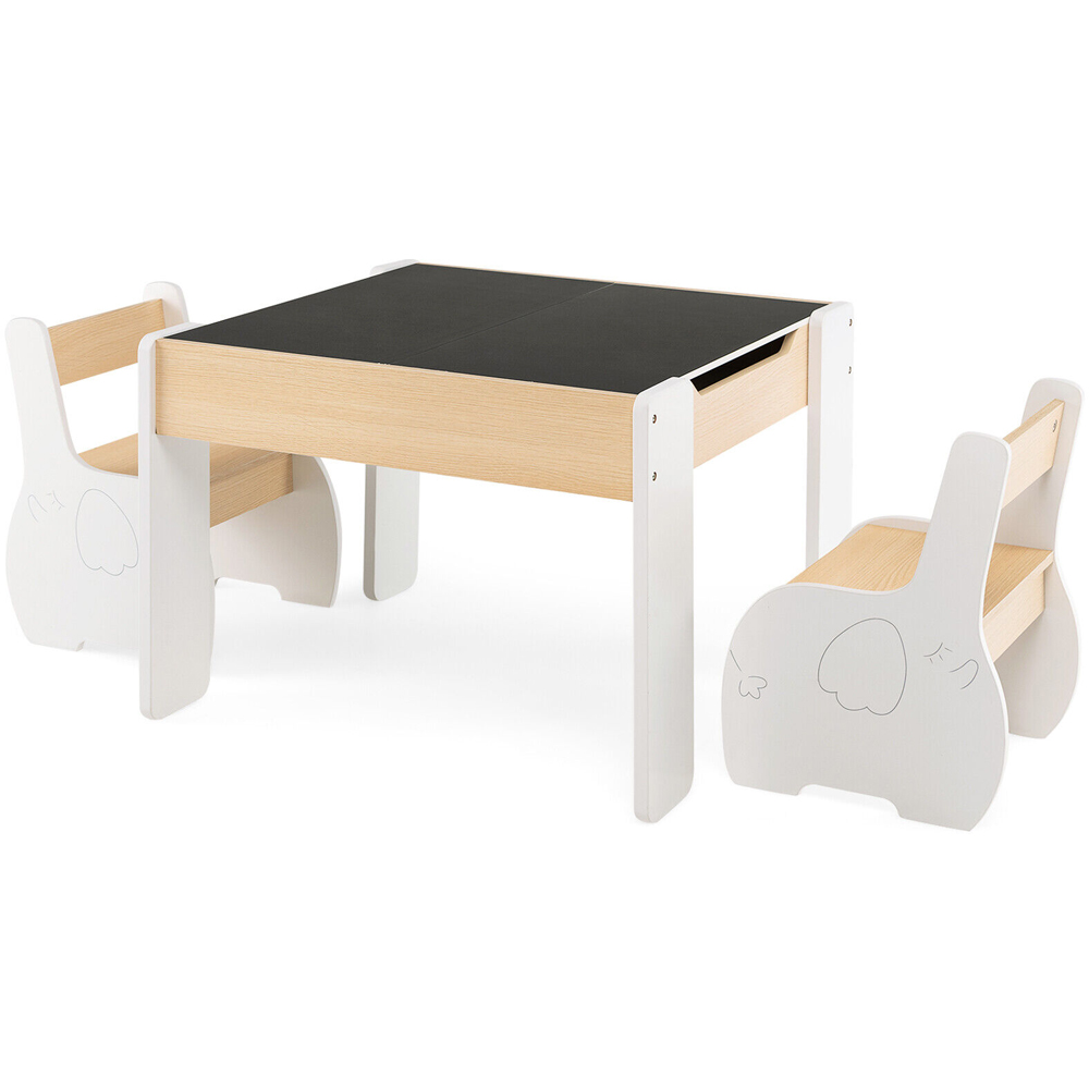 Make an adorable addition to your home space with the Costway White Table and Chair Set with Hidden Storage. This 4-in-1 activity table and chair set is a perfect learning partner for your little ones. It features a 2-in-1 reversible tabletop and can be transformed into a toy table, writing desk, drawing station and even a dining table. The ergonomic chairs along with contoured backrests help to protect their spine and cultivate good sitting posture. It is made of premium MDF with a smooth surface that is easy to clean with a damp cloth. Children can put the chairs under the table after their playtime is over. The large hidden storage space with an anti-falling baffle enables them to organise and classify toys, thereby developing good storage habits. The tabletop of this activity table is composed of two reversible and removable panels. One side is a blackboard for drawing and writing, while the other side is for reading, eating and playing. It brings endless possibilities to your children and satisfies their different creative needs. There is a roomy and partitioned storage space under the tabletop for keeping books, pens, blocks and toys. The groove design is much more convenient for children to open the top and find what they need. Crafted from a sturdy wooden structure with exquisite craftsmanship, this table and chair set is super durable and has great deformation resistance. Suitable for children between the ages of three to six years.