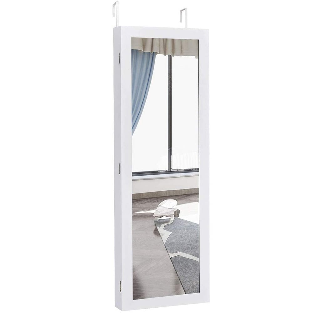 Let your jewellery collection shine brighter with the Costway White Wall Mounted Mirrored Jewellery Armoire. It features a compact design yet offers ample storage and display space for your jewellery and makeup. It is equipped with six lined shelves that include 84 earring slots and 78 earring holes for holding earrings. It also comprises 25 hooks for necklaces and bracelets, 40 ring slots and three storage shelves. It incorporates a full-length mirror that offers clear reflection and provides a wide view to check your outfit from head to toe. At the same time, a small mirror is enclosed inside the cabinet, enabling you to try on jewellery or check your makeup more conveniently. You can mount this jewellery organiser cabinet on the wall with the help of the mounted kit that comes in the package. You can also hang it over the door with two hooks which are also included. Both installation ways can save plenty of floor space and make it easy for you to place the jewellery cabinet anywhere in your bedrooms, closets, and living rooms. Crafted from high-quality MDF and glass, this door-hanging jewellery cabinet ensures great stability and durability. The magnetic door catches and smooth metal hinges allow you to open and close the door with ease. Besides, the soft velvet lining can protect your jewellery from scratching and wearing. This jewellery cabinet body is pre-assembled for a worry-free setup. With detailed instructions and complete accessories, you can install this jewellery cabinet with ease. Moreover, the smooth surface of the cabinet is sprayed with paint for easy cleaning with a damp cloth.