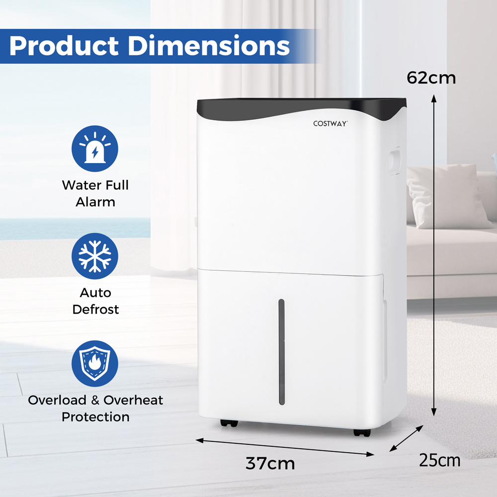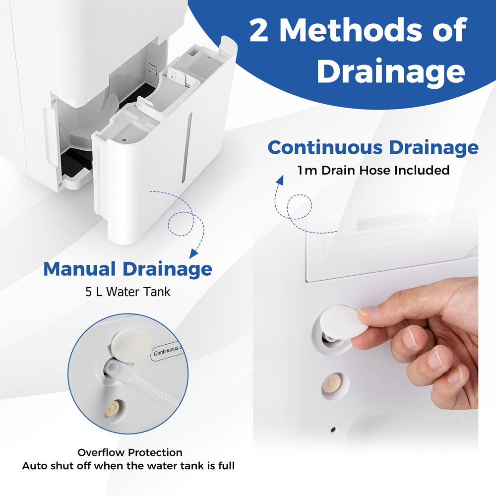 The highly efficient dehumidifier will impress you. With a 50L/day dehumidification capacity, this humidifier is capable of offering dry and comfortable air in large spaces. This humidifier features four modes (auto dehumidifying, continuously dry, sleep and fan) and two fan speeds for you to choose from. Also, this unit is built with a 24-hour timer. The unit is capable of manual and continuous drainage. More importantly, the overflow protection will auto-shut off the unit when the water tank is full. Also, the humidifier is designed with side handles and smooth castors for easy movement from room to room. Except for the touch control panel, you also can control the unit with the free app "Smart Life" which is available for Android and iOS. And regular maintenance is easy with the removable and washable air filters. For continuous drainage, the package includes a 100cm drainage pipe and the unit has a drainage hole for connection.