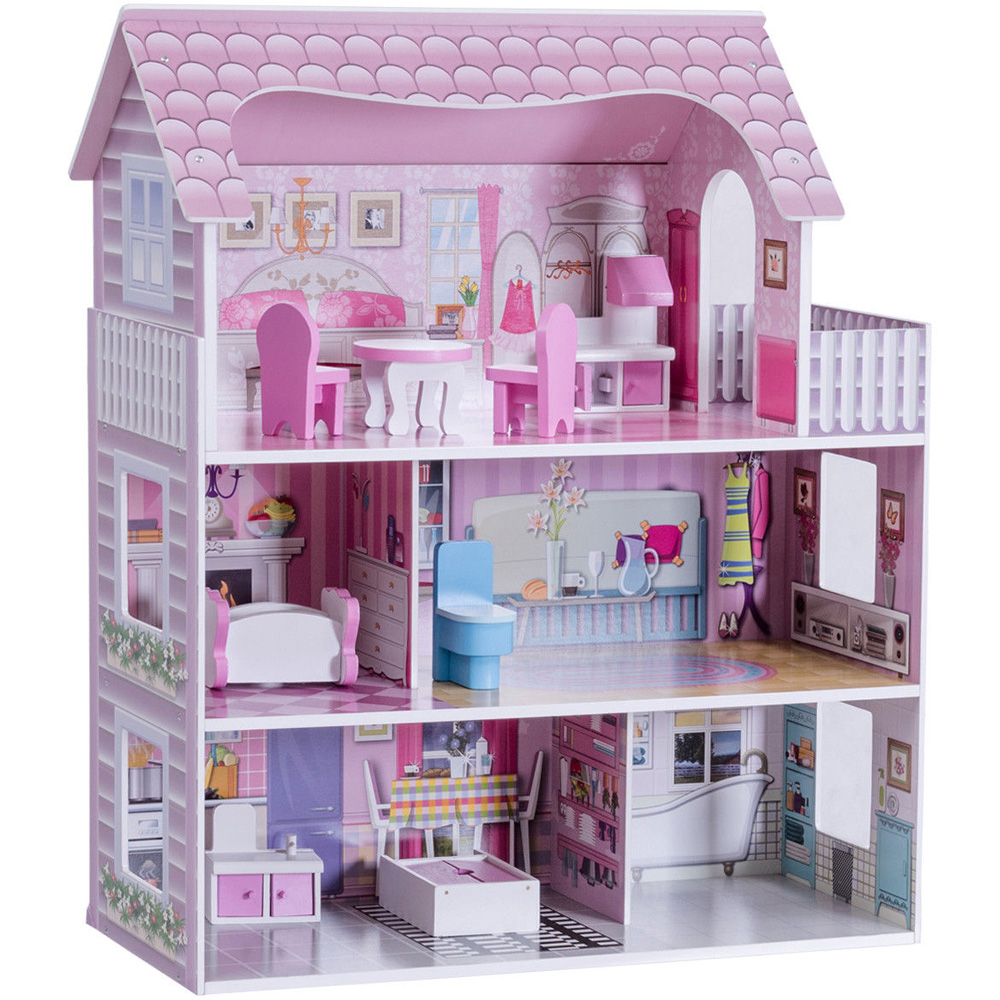 Invite enchantment into playtime with this Costway Wooden Dolls House Playset with Furniture and Accessories. This playset features three floors and five beautifully furnished rooms. Designed with child safety in mind, this dollhouse features smooth edges and is crafted from high-quality MDF that's free from BPA and harmful elements. It's not only a hub of endless fun but also a creative tool to enhance your child's imagination and spatial skills. The easy-to-follow graphic instructions empower kids to assemble the playset independently, fostering a sense of achievement. Perfect for multiple children to engage in role-playing, this charming dollhouse is an ideal gift to captivate young minds and reduce screen time.