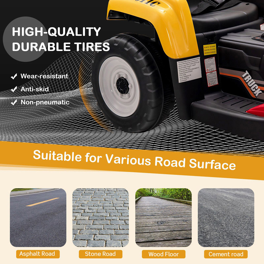 Watch your little one play around in style with the Costway Yellow Kids Ride On Bulldozer. The forward and backward lever, flexible steering wheel and foot pedal ensure children's easy operation. They can control the bucket handle to adjust the height and angle of the bucket. It's also equipped with extra remote control for parents to control the car. It features a headlight, horn, USB, and wireless connection for more joy. Anti-slip and wear-resistant wheels help kids to ride smoothly on brick roads, cement roads, wood floors, and asphalt roads. Its slow start function makes it even safer to drive. What's more, it also possesses a wide seat, safe backrest, and comfortable footrests. In addition, ASTM and CPSIA certifications make it safe for kids to use. Premium materials ensure long-lasting service life. Featuring adjustable arms and buckets, they can freely control the bucket's height and angle with the help of a bucket handle. Thus, it enables kids to pretend to dig to acquire role-playing fun. Tips: The shovel is only for decoration, and loading is not allowed. Children can use the operation lever to move forward and backwards, the steering wheel to change its direction, and the foot pedal to accelerate. On the other hand, this kids' ride-on excavator is also designed with a remote control for parents to control this vehicle(requires two AAA batteries, not included). This vehicle possesses multiple functions for a fun driving experience, including LED headlights, horns, and wireless connection. Besides, the music panel also has a USB port to connect external devices for much more music, making kids' riding process more enjoyable. The slow start function allows the car to start safely and steadily. 4 wide wheels are durable, anti-slip, and wear-resistant, allowing you to smoothly ride on brick roads, cement roads, wood floors, asphalt roads and more. Apart from that, the comfortable seat with a safety belt and wide footrests offers more safe protection. It also has passed ASTM and CPSIA certifications. This vehicle is an ideal birthday or holiday gift for three to eight old kids. Beautiful colours and realistic excavator outlook attract kids' attention at first sight. In addition, made of safe and durable materials, this digicam to accompany your little one for years.