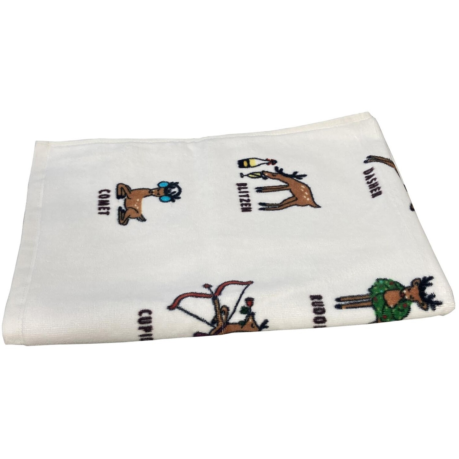 Spread the festive cheer to your bathroom with this Santas Reindeer Hand Towel. Featuring a cute illustration of each of Santa's reindeer, this towel is fun and seasonal as well as absorbent. Made from 100% Cotton, you'll love drying your hands on this charming hand towel or giving it as a gift to a loved one.