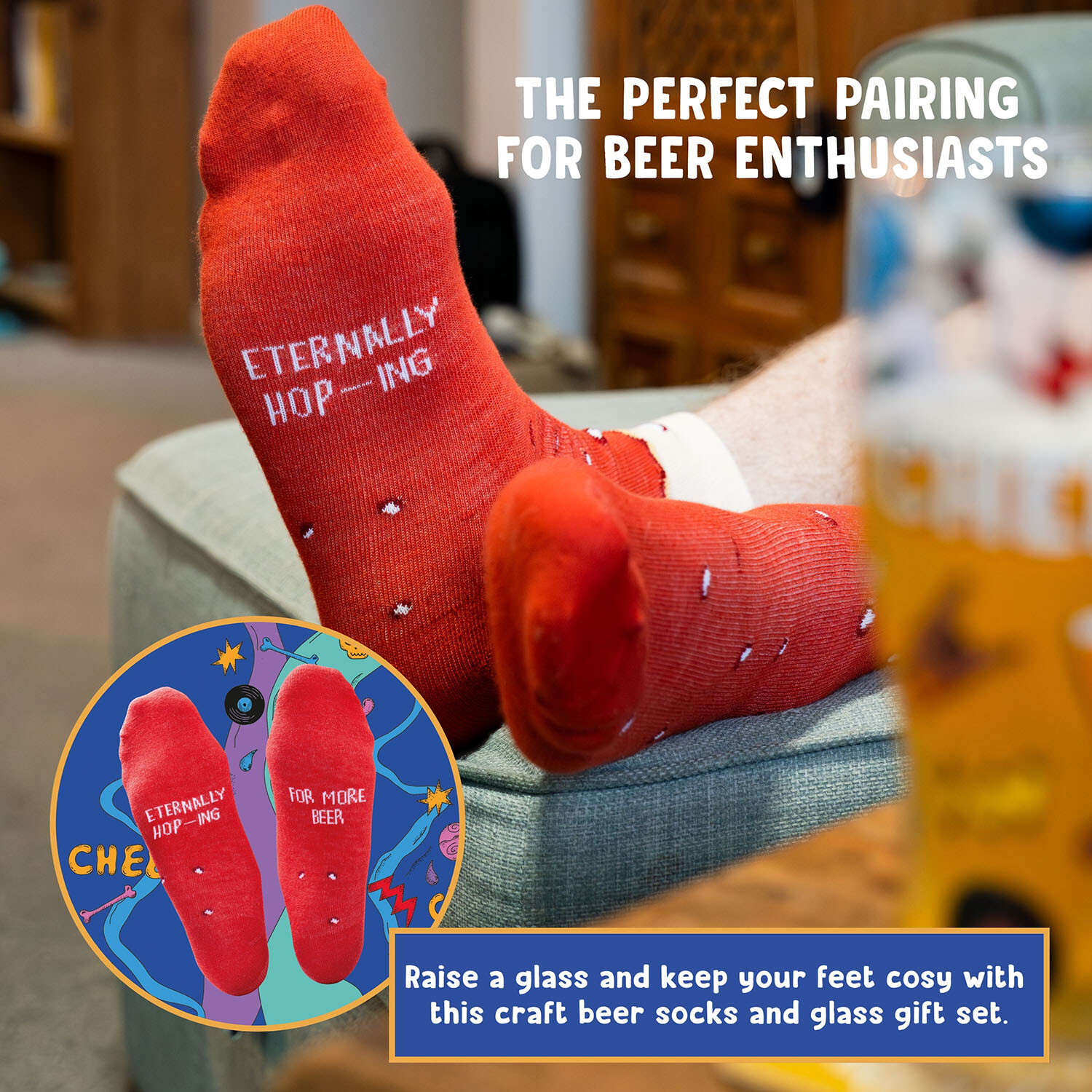 Enjoy your favourite beer while keeping your feet warm with this Craft Beer Glass and Socks Set. It consists of a colourful glass and a pair of socks in sizes 7-11. Ideal to raise a glass and keep your feet cosy, it makes a thoughtful gift for any beer enthusiast.