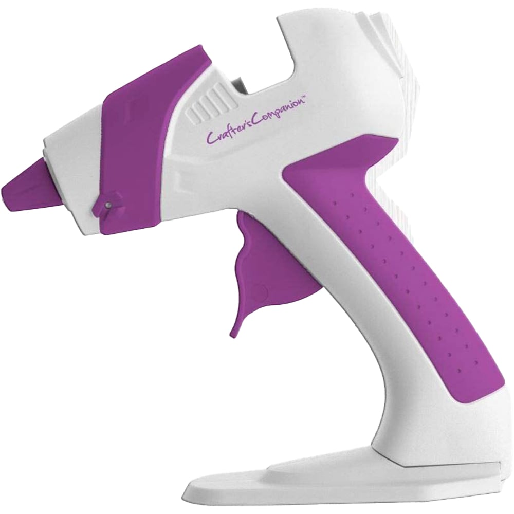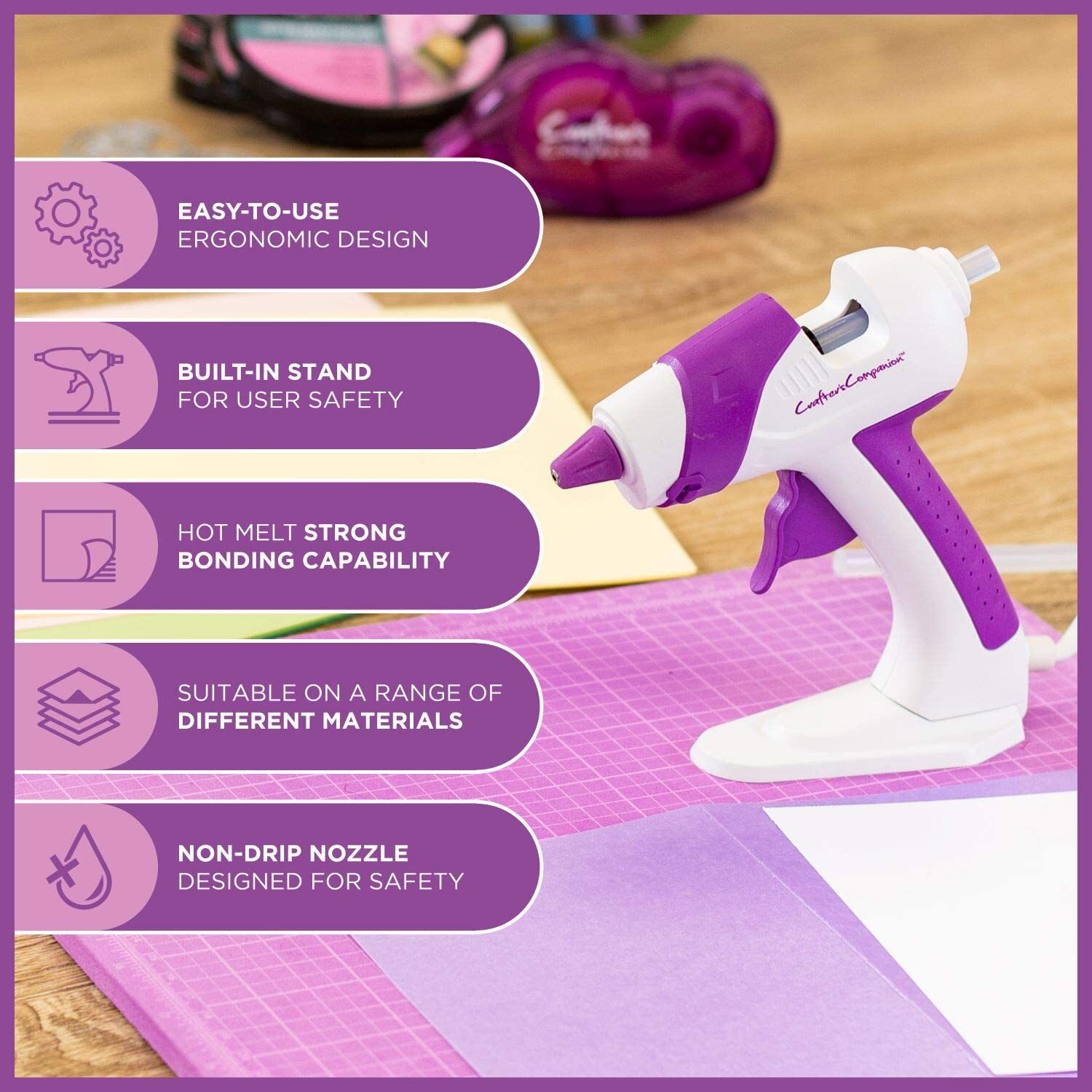 Enjoy seamless, efficient glue application with this Crafters Companion Hot Glue Gun. Featuring an ergonomic, easy-to-use design and a built-in stand, this glue gun makes applying adhesive to your DIY projects much simpler. It has been fitted with a non-drip nozzle and trigger action, so you can be sure that mistakes and mess are kept to a minimum. Offering multiple bonding capabilities, you can use this glue gun to bond numerous materials including paper, plastic, fabric, card, ceramics and much more, making it an ideal addition to your kit. Easy to use, all you need to do is push a glue stick through the back of the glue gun and into the nozzle to begin the melting and to start the flow. After this, use the trigger to continue pushing the glue stick through the chamber to apply glue to your projects. Note: Please be aware that this appliance and adhesives can reach temperatures of up to 190 degrees.