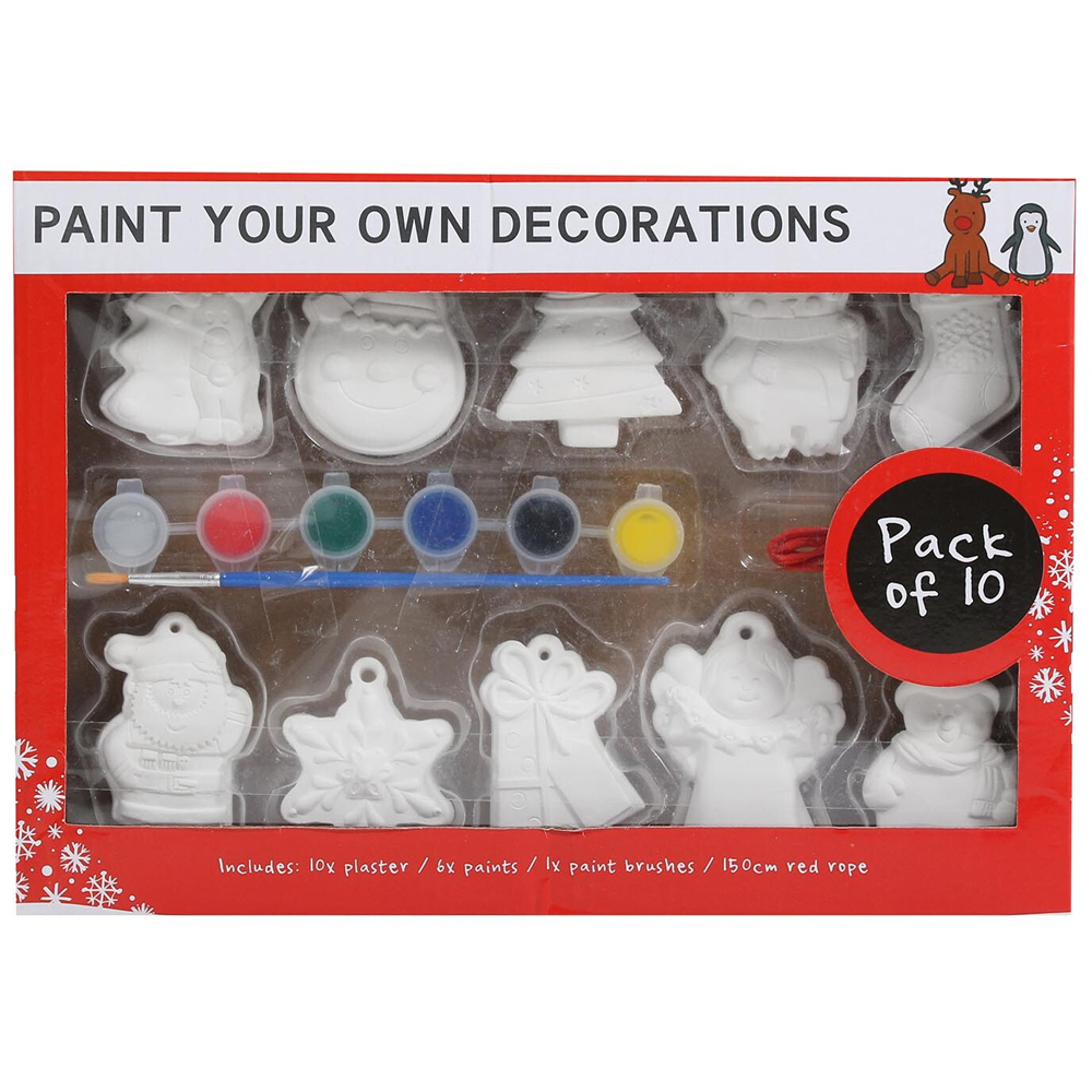 Transform your home into a winter wonderland with this Crafty Club Paint Your Own Decorations Kit. Get crafty this Christmas with this easy-to-use decorations kit. This set includes 10 plaster characters, with a snowflake, Santa, an angel, a snowman and more, six paints, one paintbrush, and 150cm of red rope to allow you to hang up your decorations with ease. Set of 10.