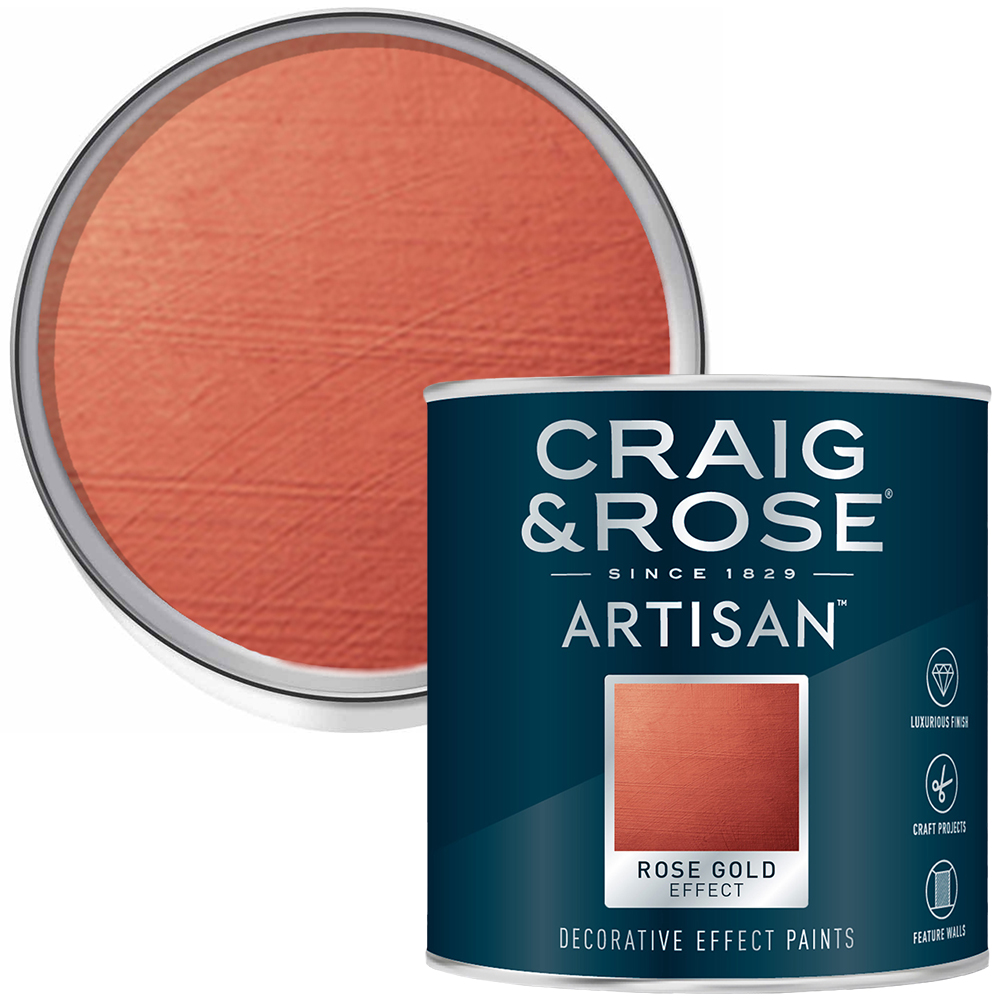 Give a new lease of life to your space with the Craig & Rose Artisan Feature Wall Rose Gold Effect Paint 250ml. This luxurious, pink-laced gold radiates a timeless and opulent feel, making it the perfect statement shade for your creative projects. Whether you're looking to add subtle rose gold accents to your furniture or aiming for a maximal effect by thoroughly coating accessories, this paint allows you to explore a world of possibilities in texture and material. Unleash your creativity by creating a gilded feature wall spectacle and complementing it with charcoal and olive-green upholstery. However, it's important to note that while the gold effect paint is ideal for indoor spaces, its delicate finish makes it unsuitable for high-wear situations, wet areas, or absorbent surfaces.