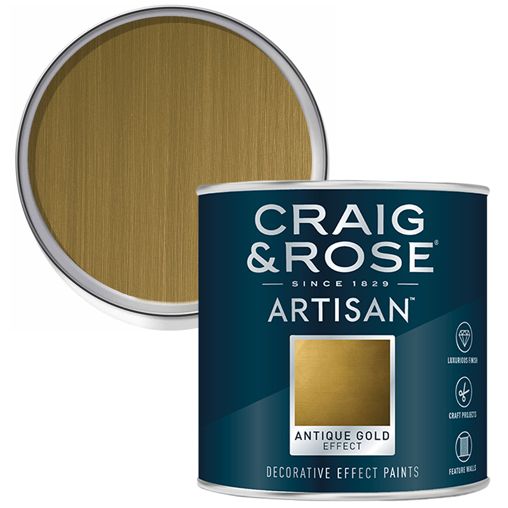 Get the perfect hue for your space with the Craig & Rose Artisan Walls & Ceilings Antique Gold Effect Mid Sheen Paint. Whether you choose to go all out or just add a hint of glitz, this paint captures the elegance and refinement of the real thing. Gold finishes are unquestionably elegant and timeless, and they have adorned homes for generations. The paint is a quick and easy way to add opulence to any design, whether it's used to recreate historical details by selecting motifs to create a dramatic effect by dripping gold over walls. A rich finish that can be used on feature walls, ceilings, trim, or furniture to give the appearance of glistening gold. The ideal application for the paint is indoors. Wet areas, absorbent surfaces, and high wear situations are not appropriate for its delicate finish. Quantity: 250ml.