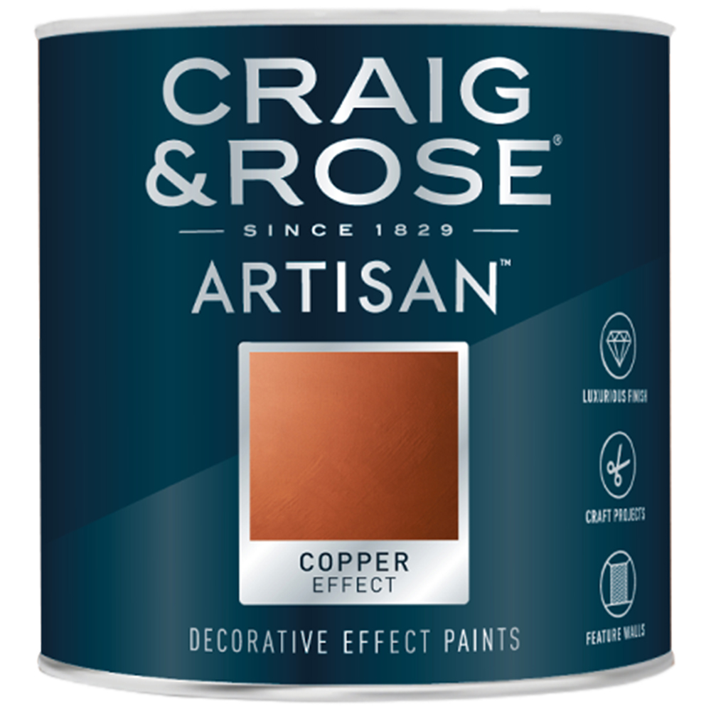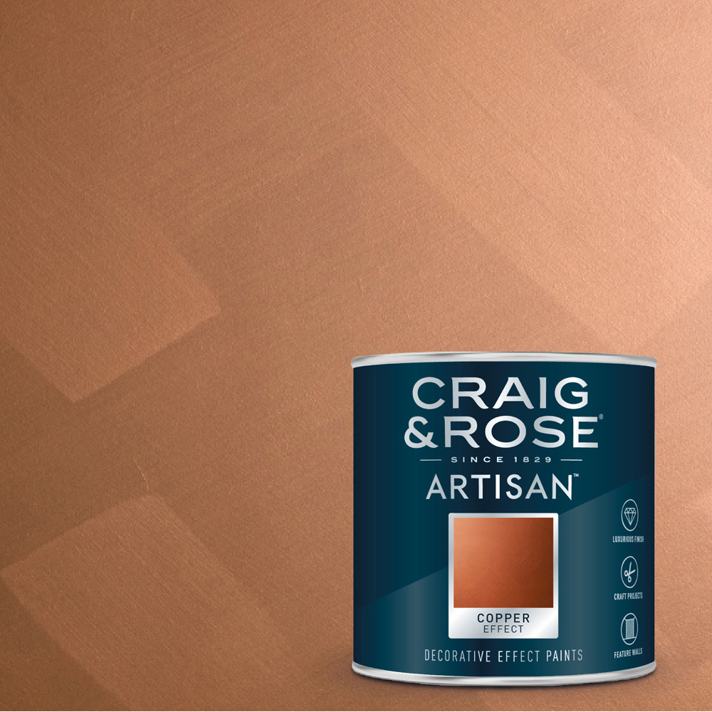 Get the perfect hue for your space with the Craig & Rose Artisan Walls & Ceilings Copper Effect Mid Sheen Paint. Embrace the timeless tactile allure of copper and achieve maximum luminosity with this paint. Update your projects with brushed, bruised, or polished copper doors, details, and decor. You could even update your garden ornaments with a modern edge and venture outside. Get the copper feel of your dreams by perfecting the finish and following the application how-tos. Apply the shiny appearance of metallic copper to focal walls or combine with complementary metallics and divergent colour palettes for a modern touch. Quantity: 2.5L.