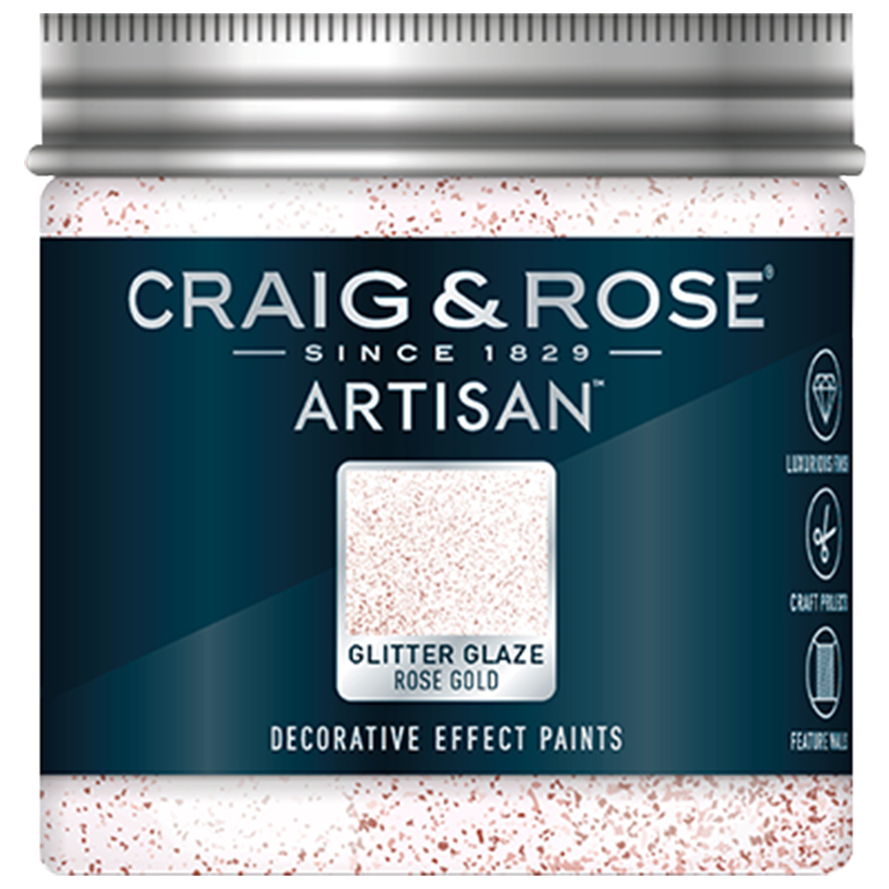 Get the perfect hue for your space with the Craig & Rose Artisan Walls & Ceilings Glitter Glaze Rose Gold Paint, a modern rose gold border paired with a glamorous glitter effect. The artisan rose gold glitter glaze adds a soft, subtle sophistication and glamour to any scheme with its warm, inviting sparkle. This sparkling glaze can be used to create a dreamy, luminescent misted rose glass effect on walls or to reinvent accessories. To achieve the desired look, apply this ready-to-use glitter paint over any chalky emulsion colour. Apply extra coats to increase the sparkle's intensity. Quantity: 300ml.