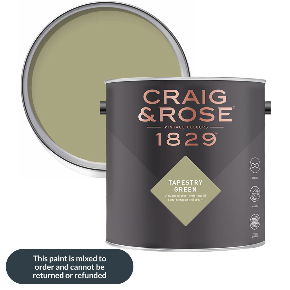 Experience the subtle effect of the Craig & Rose Kitchen and Bathroom Tapestry Green Eggshell Paint 750ml. It features sage and tarragon with a little cream shade. This paint is suitable for airy spaces with an elegant 19th century feel. It is perfect for use on walls and furniture and features a soothing finish. It is ideal for use in kitchens, bathrooms and high-traffic areas. This paint is durable and washable with excellent coverage. It can be used for an entire room or to create an eye-catching feature wall according to your preference.