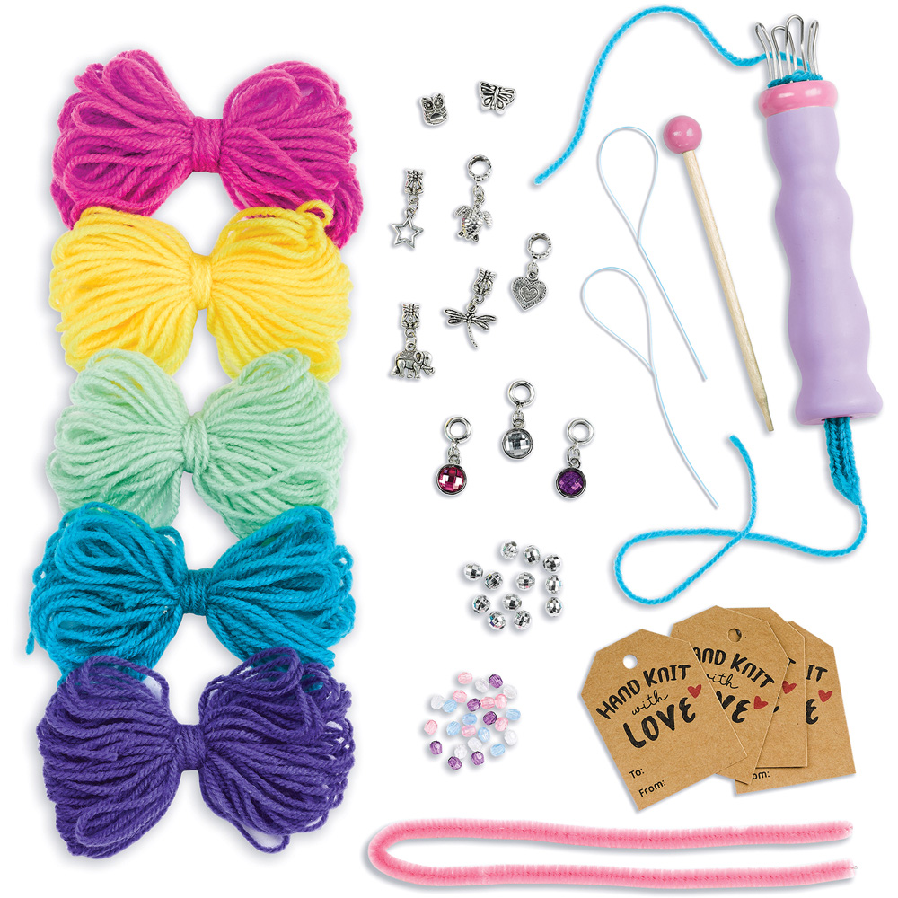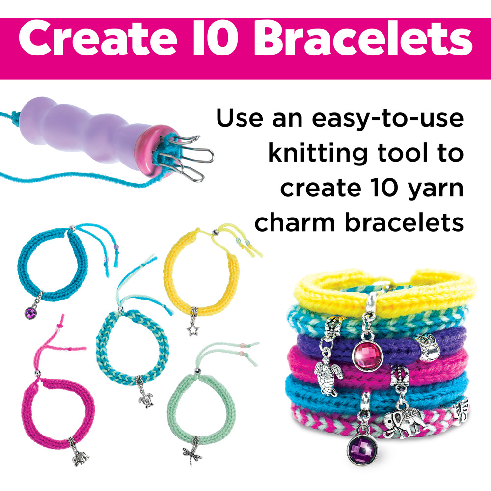 Create your own charm bracelets with charms and gems! Use sparkly and vibrant beads and charms to create friendship bracelets that match your style and personality. Comes with 5 yarn bundles - knitting tool - knitting pick - 10 charms - 36 assorted beads - floss threaders - gift tags - chenille stem and step-by-step illustrated instructions. Use the knitting spool to create soft knit bracelets with ease! Simply wrap and hook the yarn around the knitting spool to create your own braided charm bracelets. Charm Bracelet craft activity comes with illustrated step-by-step instructions that will make creating your own friendship bracelets easy! Ages: 9+