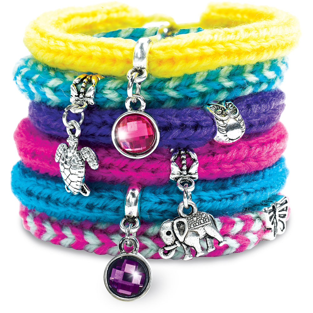 • Knits a set of trendy charm bracelets