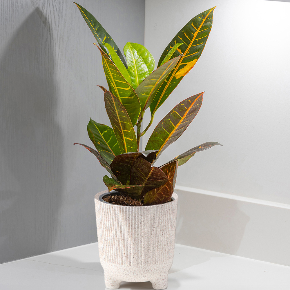 Unleash your inner gardener with our Croton Plant with Off White Recycled Pot Cover 12cm. Our Croton Plant adds a vibrant foliage display to your houseplant collection. This variety boasts a wide range of leaf shapes and colours, adding natural character to any room. Commonly known as 'Joseph's Coat' for its variegated mix of green, yellow, and red, this plant thrives in bright, direct light. It comes in a 12cm plant pot and a 16cm pot cover made from 100% recycled materials, including up to 30% wood chippings. No messy repotting is needed; place the plant with the nursery pot into the watertight cover. This established plant grows to approximately 100cm in height and width.