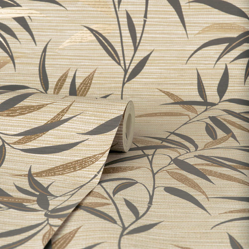 Add personality to your decor with the Crown Fusion Leaf Natural Wallpaper. This wallpaper features luxurious bamboo leaves with metallic highlights which set against a realistic grasscloth texture. Not only does it boast the intricate detail of grasscloth, but it also has a luxurious feel. Crafted with water-based inks, this wallpaper includes a striking feature wall design. This timeless design offers a striking look for any interior space and can be perfectly paired with its coordinating fusion textured plain.