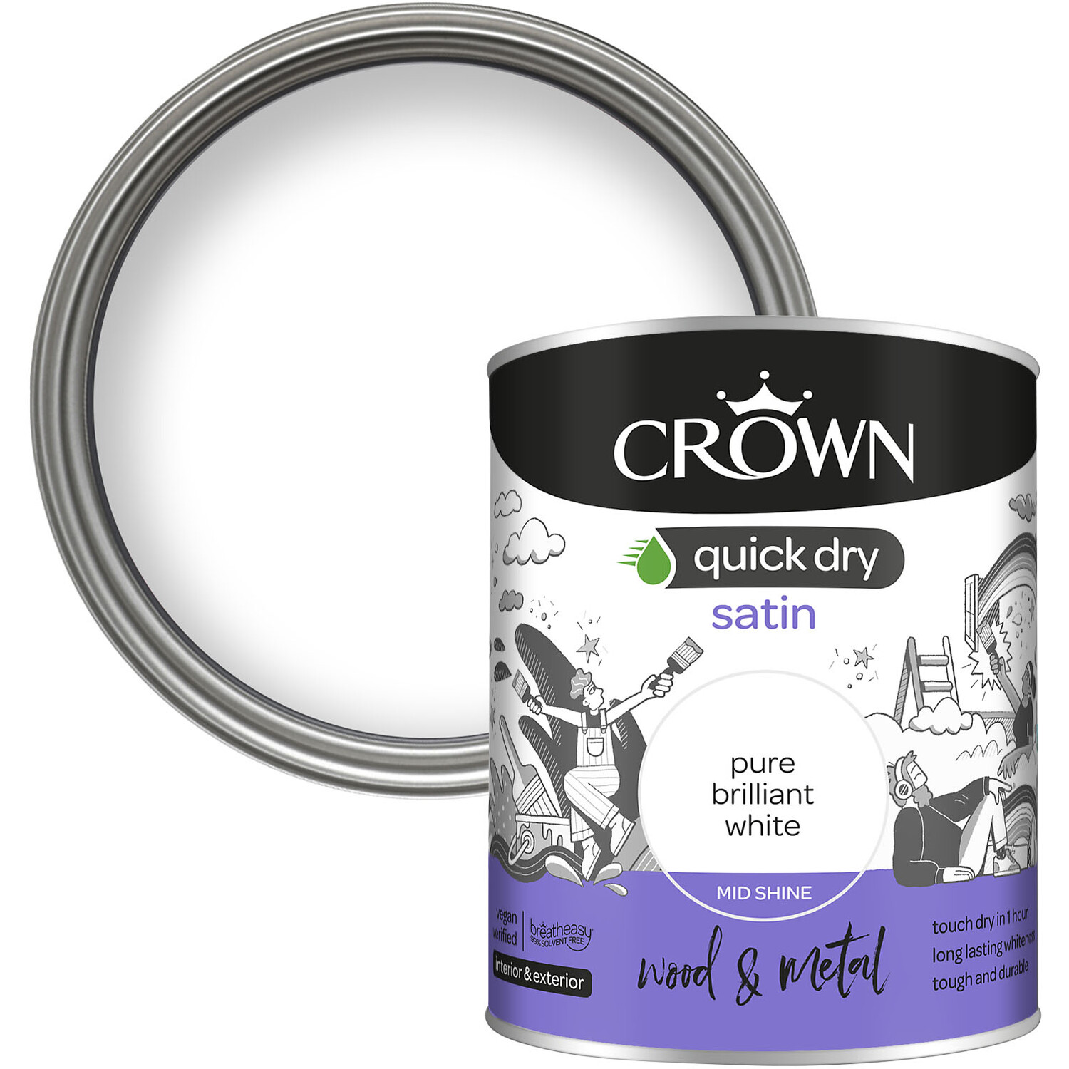 Choose convenience with the exceptional Crown Quick Dry Satin Wood and Metal Paint 750ml in Pure Brilliant White. This water-based paint provides a tough, wipeable, mid-shine finish with long-lasting whiteness for interior and exterior wood, metal and PVCu. Touch dry in just one hour, complete your project with ease and enjoy fresh skirting boards, radiators and furniture or exterior railings, doors and windows. Created using carefully selected vegan-verified ingredients, Crown's unique breatheasy® 99% solvent-free technology limits exposure to airborne triggers of asthma and allergy, helping to create a healthier space for all.