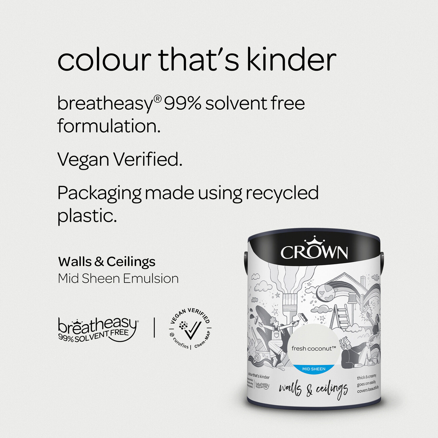 Crown Walls and Ceilings Mid Sheen Emulsion provides a rich, reflective finish, for a subtle surface shine. Offering excellent versatility and complete coverage, this water-based paint can be applied throughout your entire home including living rooms, dining rooms, bedrooms and hallways. Using carefully selected Vegan Verified ingredients, Crown’s unique breatheasy® 99% solvent-free formulation offers you the confidence to decorate your home safely. Limiting exposure to airborne triggers of asthma and allergy, it helps create a healthier space for your whole family; and we are pushing what's possible even further with packaging made using recycled plastic. This durable paint is sure to give your home a new lease of life and is wipeable so you can keep your walls looking their best.