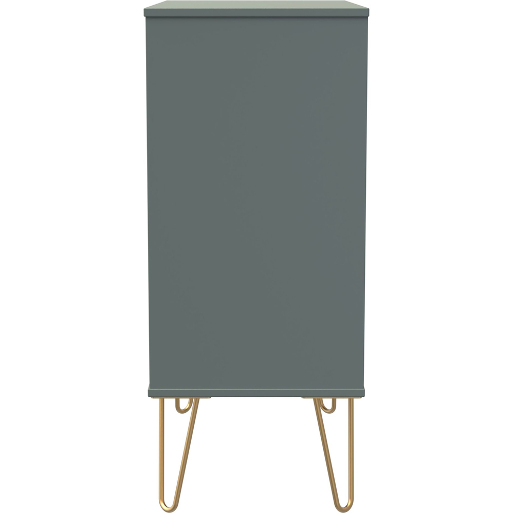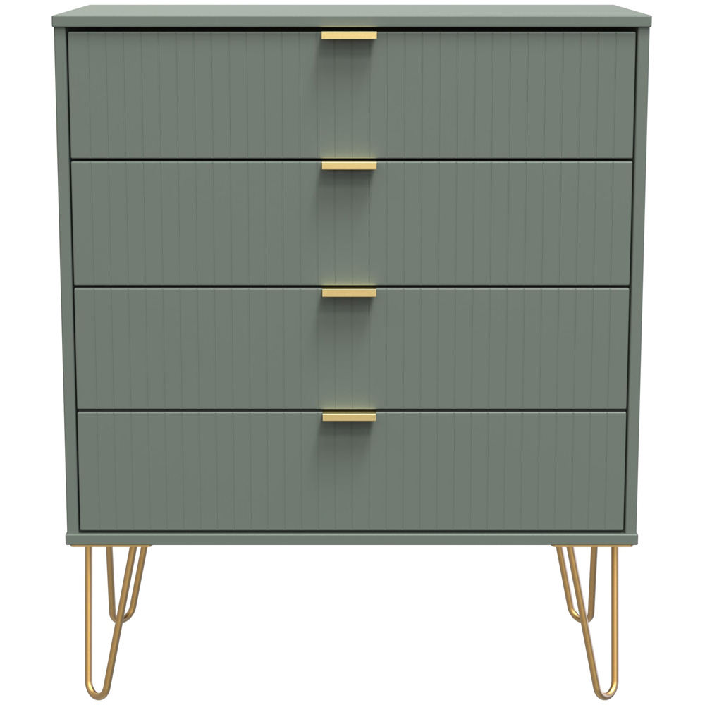 Make a beautiful addition to your home decor with this Crowndale Four Drawer Reed Green Wide Chest of Drawers. This chest of drawers is perfect for any home as a free-standing storage unit and is named for the drawer fronts' unique "Linear" pattern. It is scratch-resistant and has a reed green finish. The chest features four drawers with gold metal handles, gold hairpin legs and smooth metal drawer runners. Also, it is made in the United Kingdom, is of the highest quality, and is delivered directly to your location of choice by one of the two-person delivery teams. It comes fully assembled (although legs may be removed to prevent damage in transit).