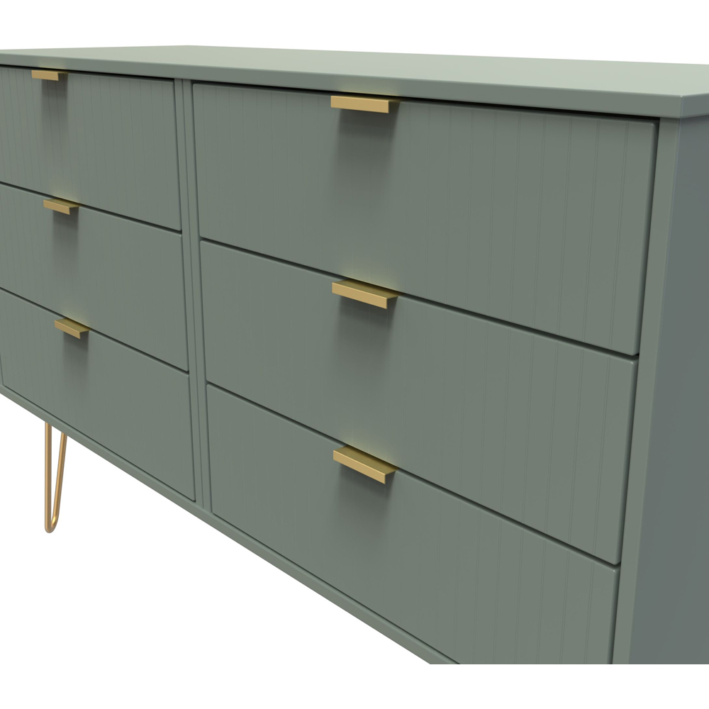 Make a beautiful addition to your home decor with this Crowndale Six Drawer Reed Green Wide Chest of Drawers. This chest of drawers is perfect for any home as a free-standing storage unit and is named for the drawer fronts' unique "Linear" pattern. It is scratch-resistant and has a reed green finish. The chest features six drawers with gold metal handles, gold hairpin legs and smooth metal drawer runners. Also, it is made in the United Kingdom, is of the highest quality, and is delivered directly to your location of choice by one of the two-person delivery teams. It comes fully assembled (although legs may be removed to prevent damage in transit).