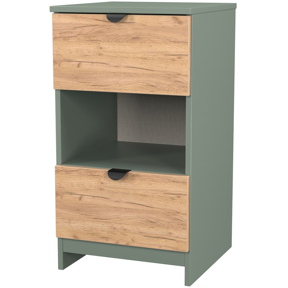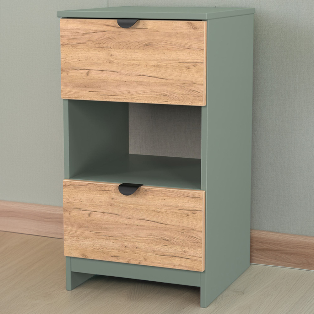 This standard height bedside cabinet features 2 sturdy storage drawers and a central open storage shelf making it both practical and stylish. Looking for something a bit different, then this range of furniture should be what you are looking for. Incorporating open shelf storage into it's design make sit one of our most practical ranges without sacrificing it's clean elegant style. This is also enhanced by the contemporary black metal handles. Guaranteed to stand out in any modern home. All our furniture is made in the United Kingdom, to the highest quality. It is delivered direct to your location of choice by one of our two man delivery teams, and come full assembled (although legs may be removed to prevent damage in transit).